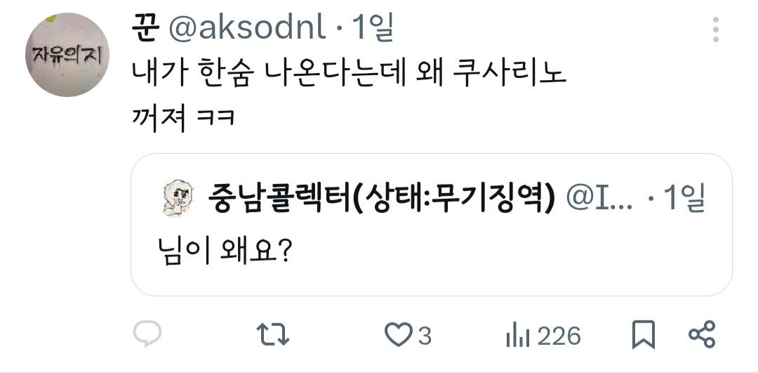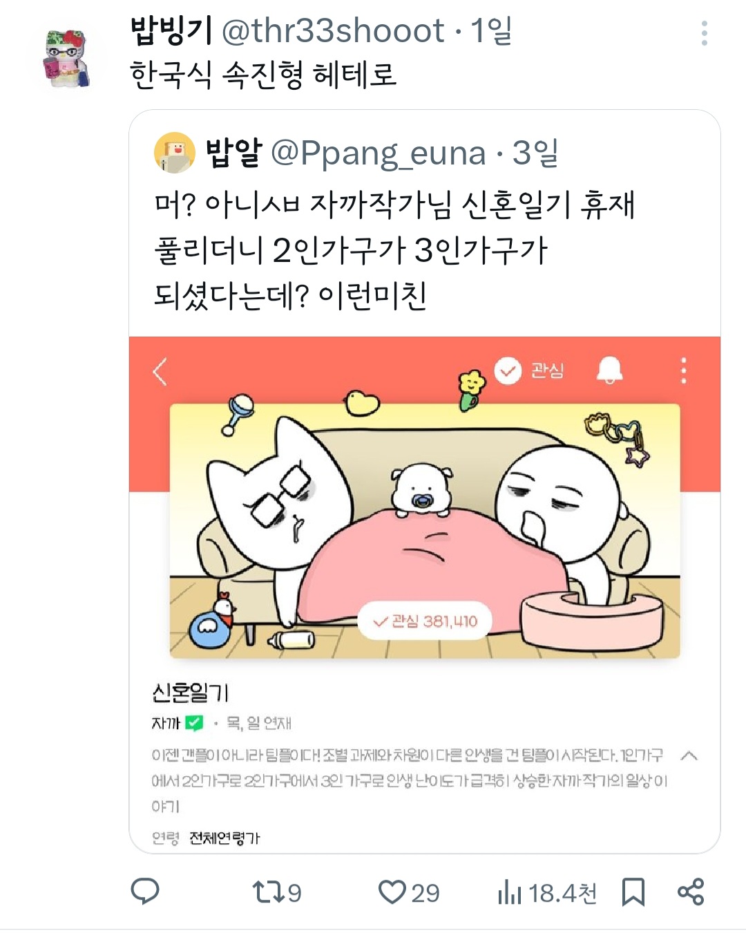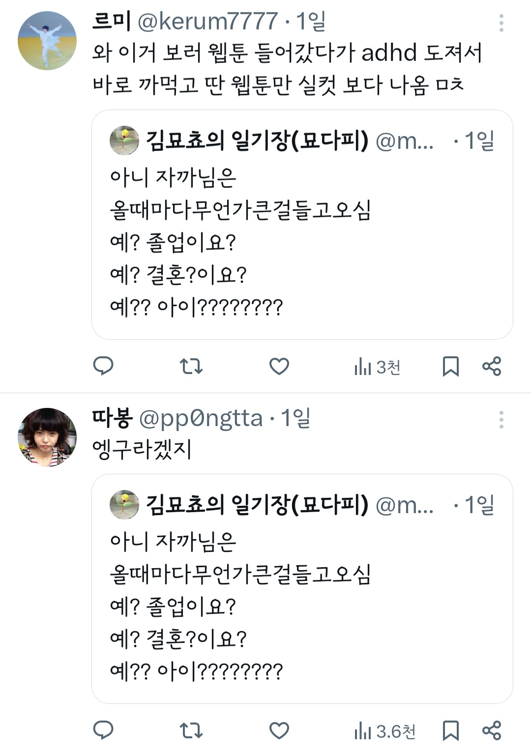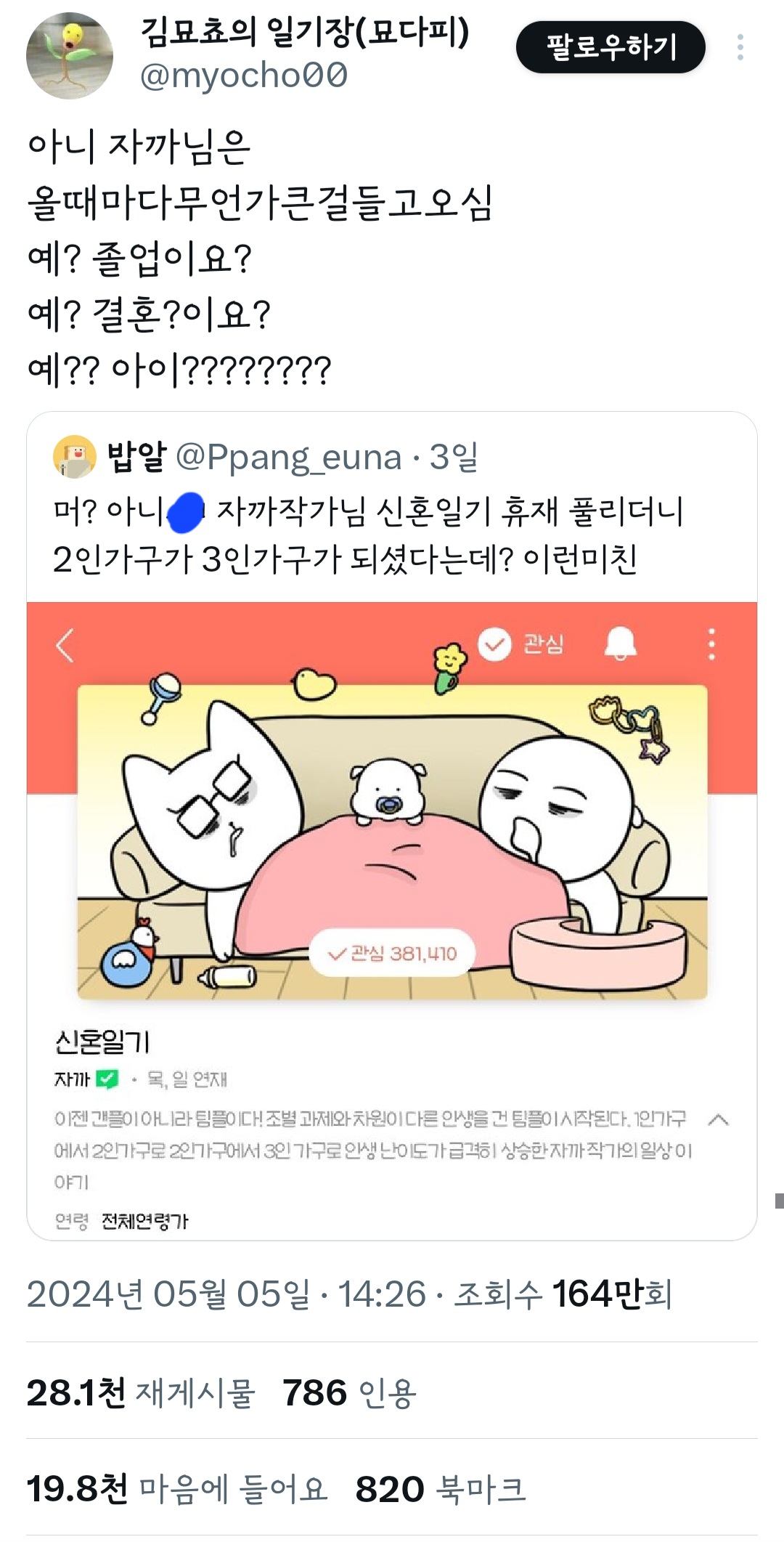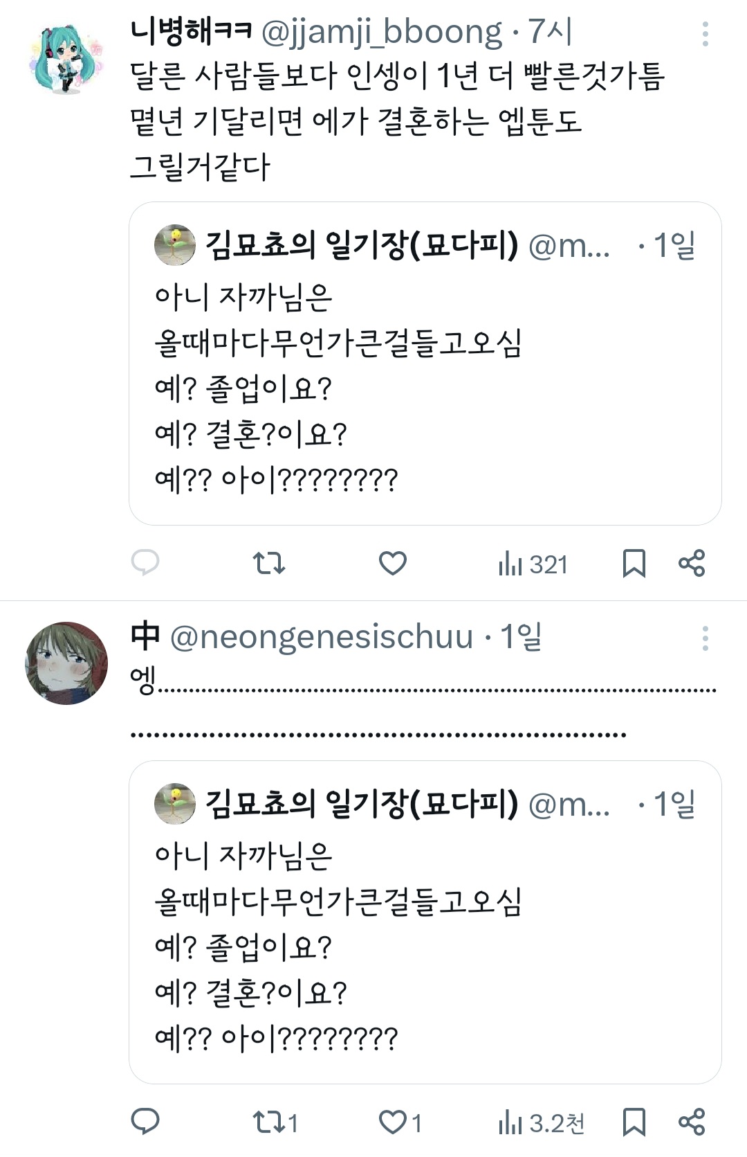 작성자띠용핑 작성시간 24.05.09 그냥 행복하신가보다~신기하다 하고 넘겼는데 저걸 굳이 욕하는 건 뭐지 결이 안맞으면 안보면 되는걸 ㅠ