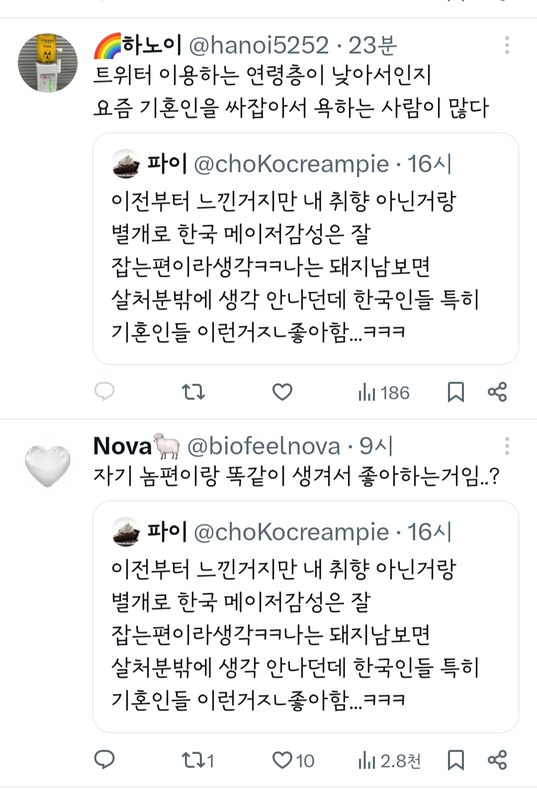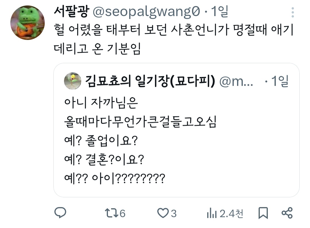 작성자딤엄린안 작성시간 24.05.09 에휴 힘도좋다 그냥 안보면되는걸... 나도 비혼이고 자까 대학일기 이후로 안봄 주변 실제 기혼여성 앞에서 면대면으로 할 수 있는말 아니면 하지좀 마