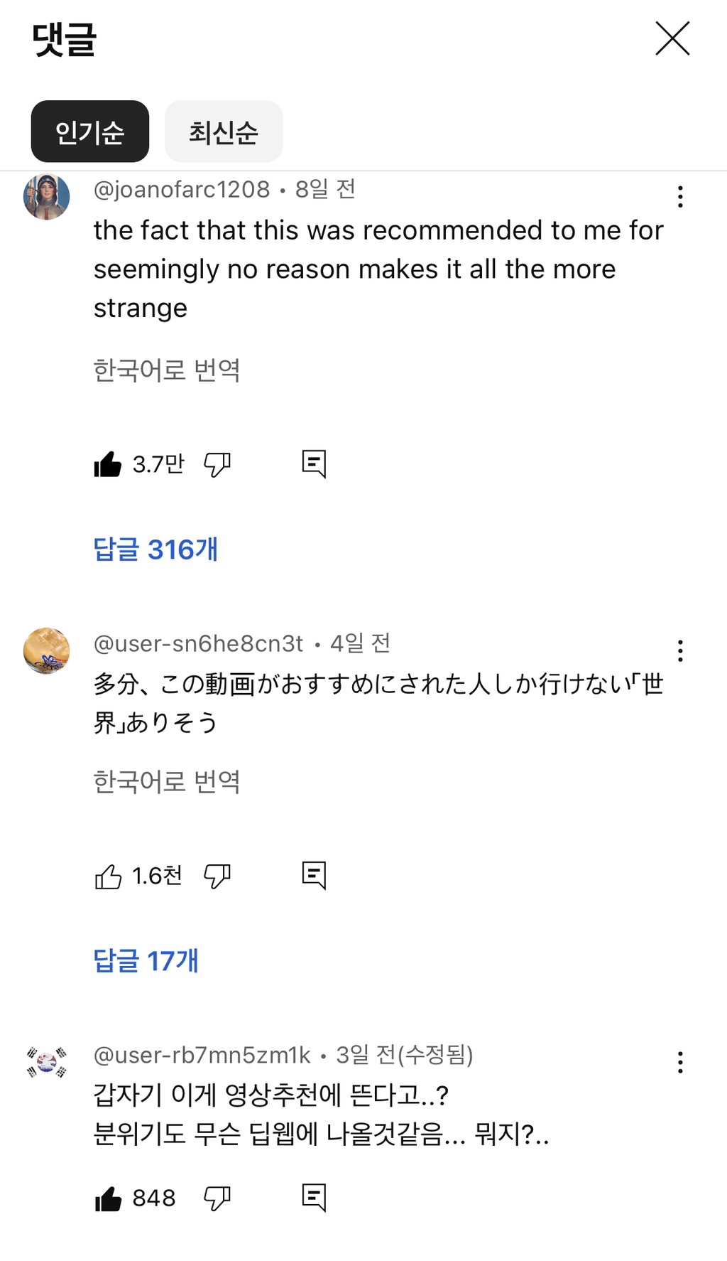 동시다발적으로 알고리즘을 탄 것으로 보이는 영상은