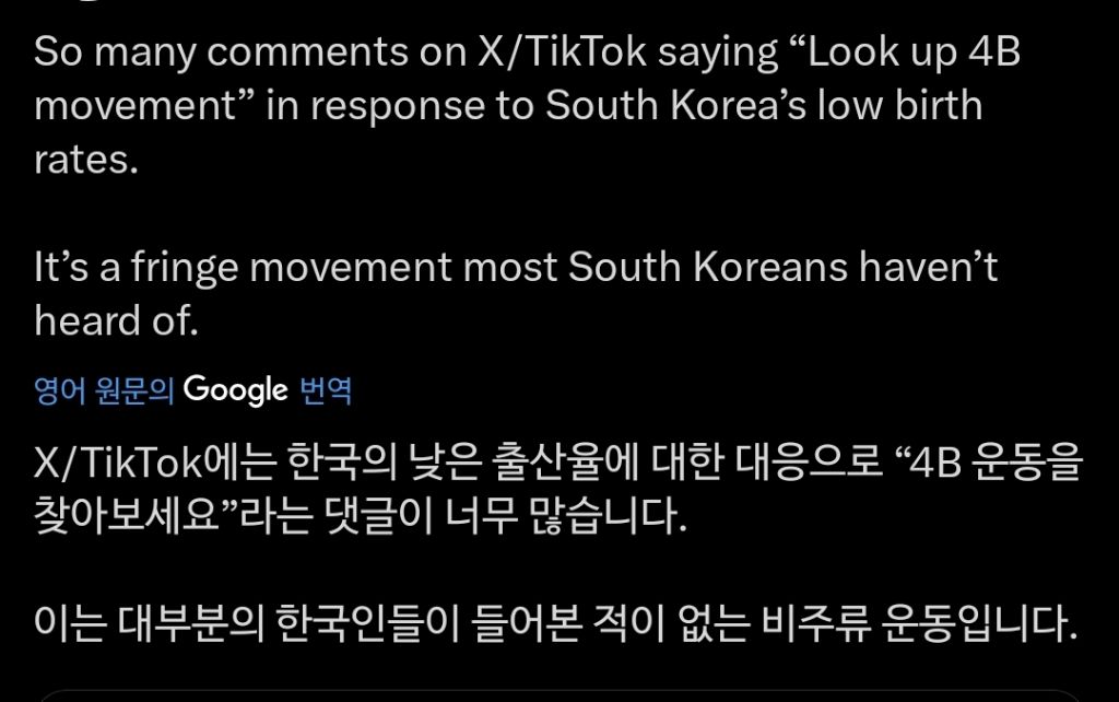 막상 한국에서는 4b는 운동이 아니라고 (어떤 의미인지는 알지만) 누가봐도 강성 4b면서도 오해의 소지있게 말하는 여성들이 많더라고...! 최근 4b에 대한 외국 주목도도 높아진만큼 반대급부로 4b란 실존하지 않는다고 까내리려는 외국 남자인셀들도 존많이니까 지양했으면 좋겠음. 특히 한국에 한뿌리 걸치고 있는 검은머리 외국인분들이.. 4b는 졀대 없다고 출생률과 여성차별은 관련없다고 지랄중이니까...^^