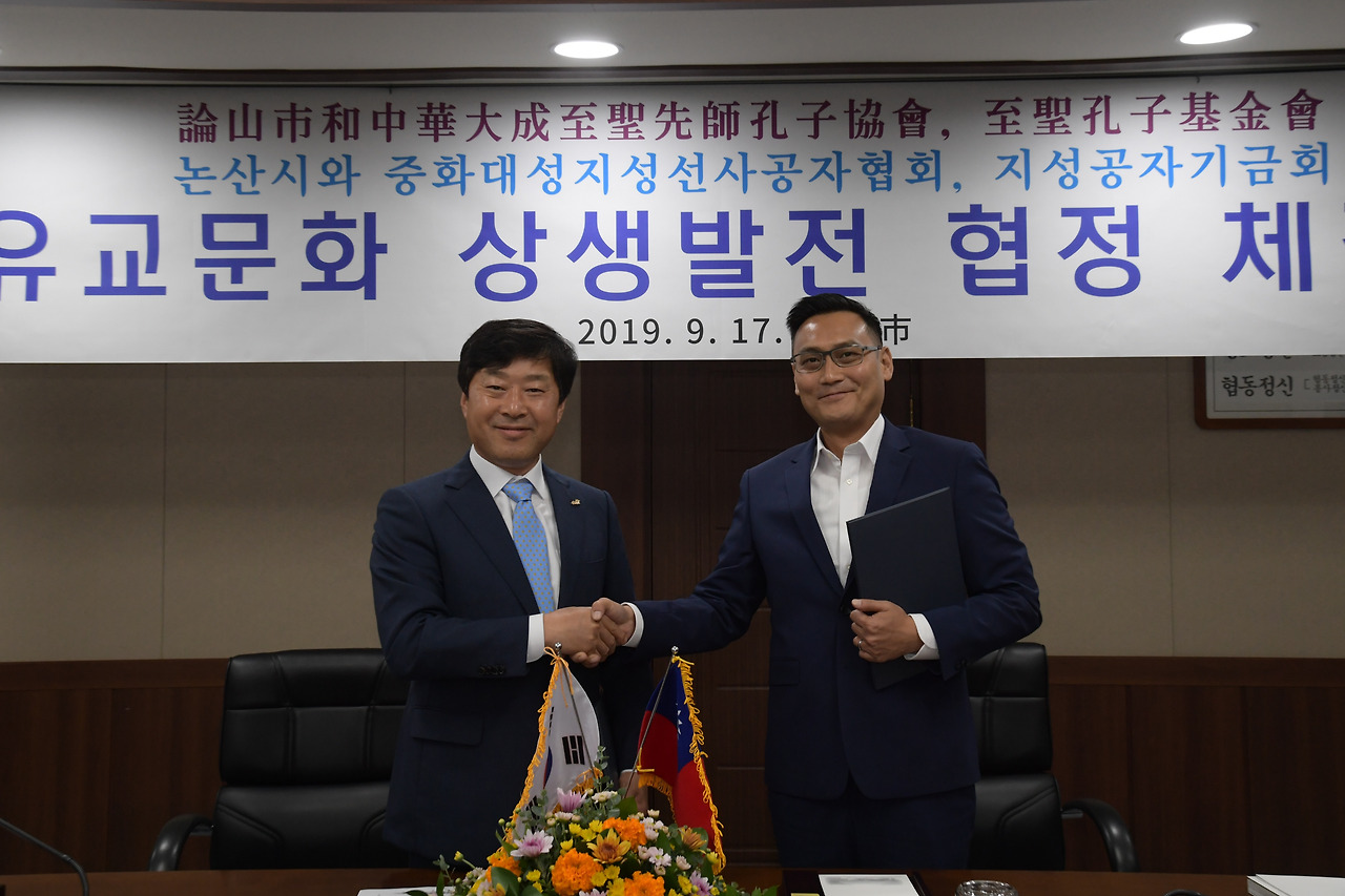 논산시가 지난 17일 시청에서 동양 사상의 근간을 이룬 공자(孔子·기원전 551~489)의 제79대 적장손 콩추이장(孔垂長) 봉사관과 유교문화의 이해증진 및 교류협력을 위한 ‘유교문화 상생발전 협정’을 체결했다.