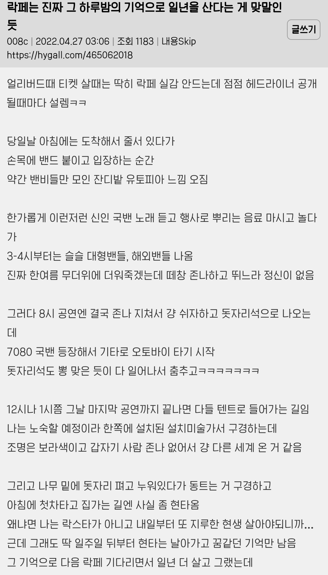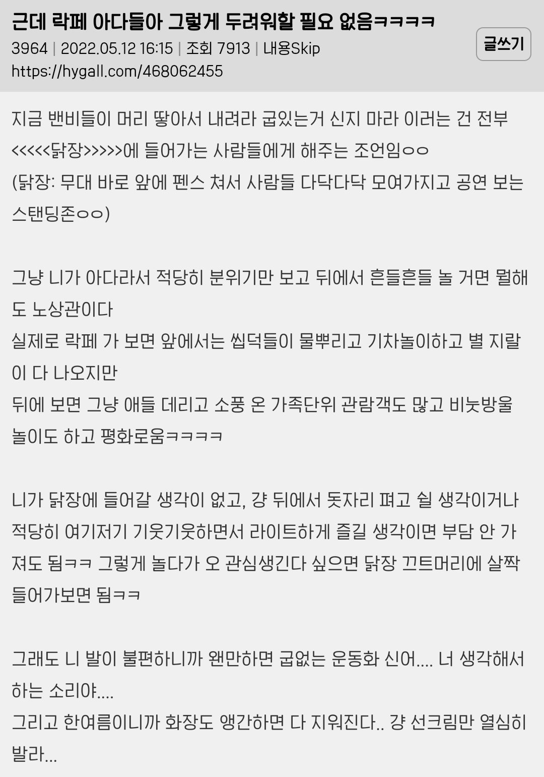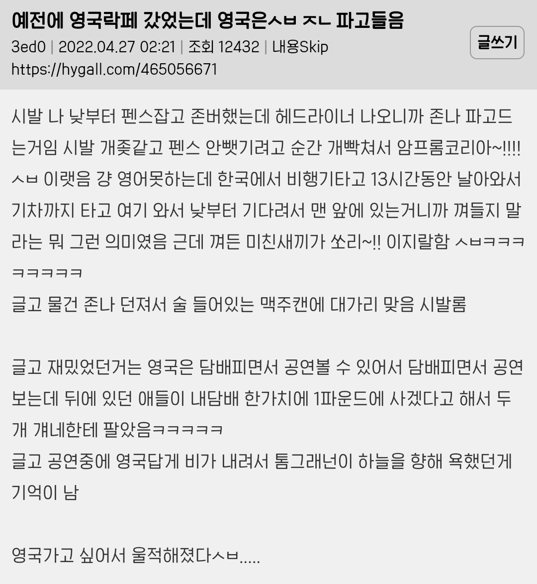 [스크랩] [흥미돋]락페는 진짜 그 하루밤의 기억으로 일년을 산다는 게 맞말인듯 작성자버섯된찌|작성시간24.05.11|조회수4,460 목록 댓글 27 글자크기 작게가 글자크기 크게가 출처 : 해연갤상세주소는 캡쳐 안에펄럭 = 한국붕/붕붕/붕키 = 저 커뮤 호칭(ex.여시)밴비 = 밴드팬교주 = 좋아하는 연예인국밴 = 국내밴드밴 = 밴드 (= 서치용 키워드)오아시스는 2009년 지산 락페로 내한하고 한달 후 해체했다ㅁㅇㅇㅇ = 마이웨이쪽본 = 일본서재페 = 서울재즈페스티벌바게트국 = 프랑스꽃가마 = 셔틀버스 / 써방 아니고 진짜 업체 이름이 꽃가마임 / ㅇㅅㅌㅁㅇ = 왕셀털미안 / 셀털 = 셀프 신상털기임히어로 = 임영웅김말국 = 김치말이국수지산 락페 후원하던 CJ가 손 떼서 이제 안 함..🥲 다음검색 스크랩 원문 : *여성시대* 차분한 20대들의 알흠다운 공간 현재 게시글 추가 기능 열기 북마크 공유하기 신고 센터로 신고 댓글 댓글 27 댓글쓰기 답글쓰기 댓글 리스트 작성자밴드붐은왔음 | 작성시간 24.05.11 ㅈㅎㄴ나재밌음 씨발.. 혼자가도 존나 즐거워 눈물나 작성자saint jaggy | 작성시간 24.05.11 후후 고딩때 09지산간 내가 승리자다 작성자스타후르츠와인 | 작성시간 24.05.12 그러니까 라이납좀 잘 나 휀타야....;;; 작성자월피 | 작성시간 24.05.18 락페 가보고 싶엌ㅋ 작성자마구니드라 | 작성시간 24.06.07 땀나고물맞고 냄새안나? 댓글 전체보기