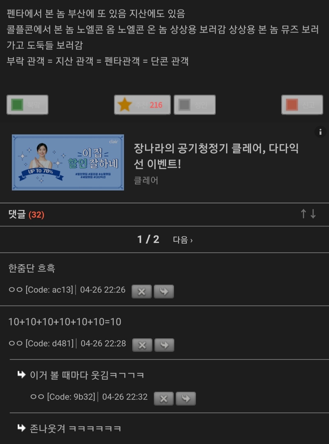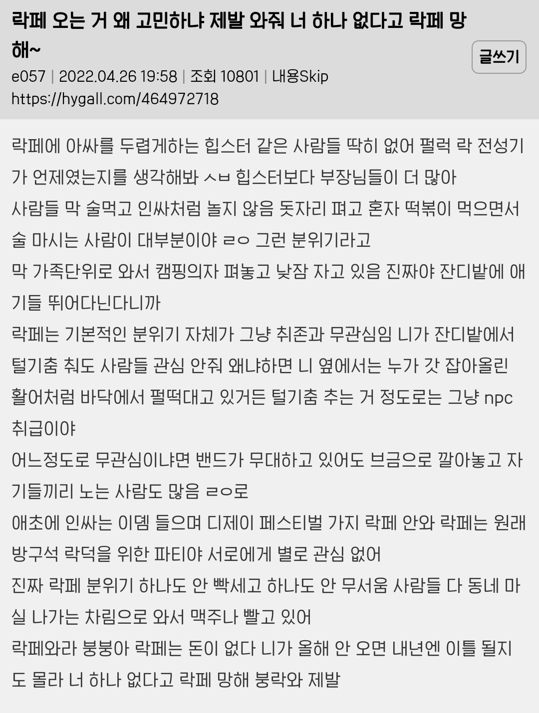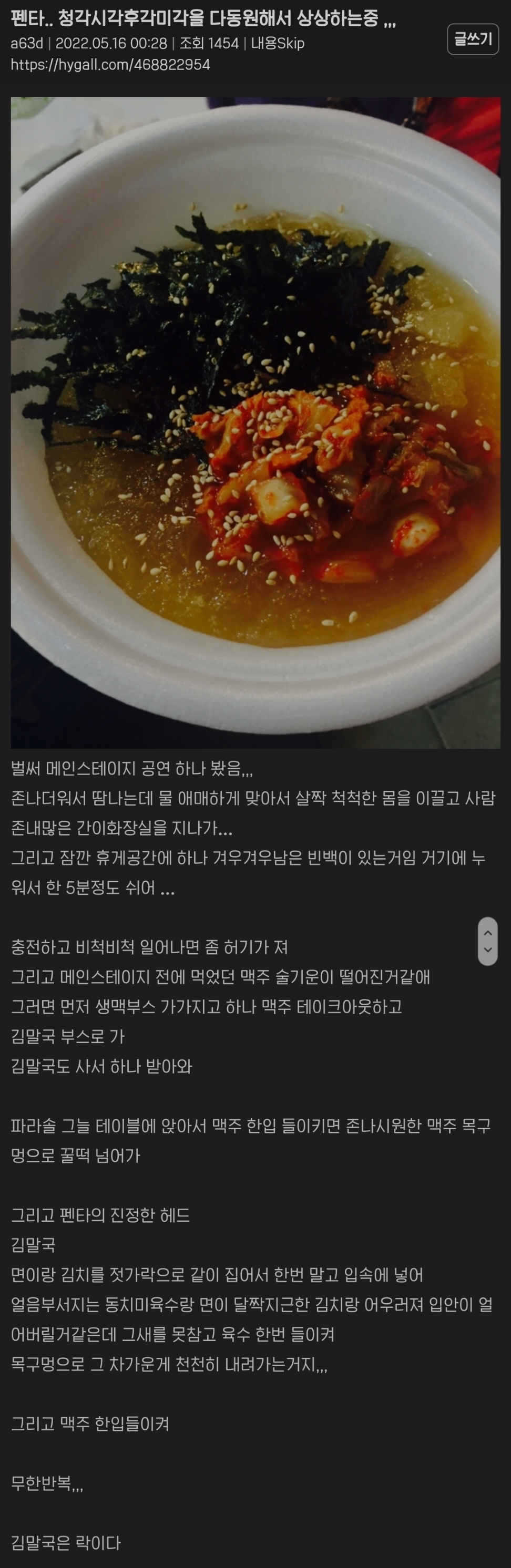 [스크랩] [흥미돋]락페는 진짜 그 하루밤의 기억으로 일년을 산다는 게 맞말인듯 작성자버섯된찌|작성시간24.05.11|조회수4,460 목록 댓글 27 글자크기 작게가 글자크기 크게가 출처 : 해연갤상세주소는 캡쳐 안에펄럭 = 한국붕/붕붕/붕키 = 저 커뮤 호칭(ex.여시)밴비 = 밴드팬교주 = 좋아하는 연예인국밴 = 국내밴드밴 = 밴드 (= 서치용 키워드)오아시스는 2009년 지산 락페로 내한하고 한달 후 해체했다ㅁㅇㅇㅇ = 마이웨이쪽본 = 일본서재페 = 서울재즈페스티벌바게트국 = 프랑스꽃가마 = 셔틀버스 / 써방 아니고 진짜 업체 이름이 꽃가마임 / ㅇㅅㅌㅁㅇ = 왕셀털미안 / 셀털 = 셀프 신상털기임히어로 = 임영웅김말국 = 김치말이국수지산 락페 후원하던 CJ가 손 떼서 이제 안 함..🥲 다음검색 스크랩 원문 : *여성시대* 차분한 20대들의 알흠다운 공간 현재 게시글 추가 기능 열기 북마크 공유하기 신고 센터로 신고 댓글 댓글 27 댓글쓰기 답글쓰기 댓글 리스트 작성자밴드붐은왔음 | 작성시간 24.05.11 ㅈㅎㄴ나재밌음 씨발.. 혼자가도 존나 즐거워 눈물나 작성자saint jaggy | 작성시간 24.05.11 후후 고딩때 09지산간 내가 승리자다 작성자스타후르츠와인 | 작성시간 24.05.12 그러니까 라이납좀 잘 나 휀타야....;;; 작성자월피 | 작성시간 24.05.18 락페 가보고 싶엌ㅋ 작성자마구니드라 | 작성시간 24.06.07 땀나고물맞고 냄새안나? 댓글 전체보기