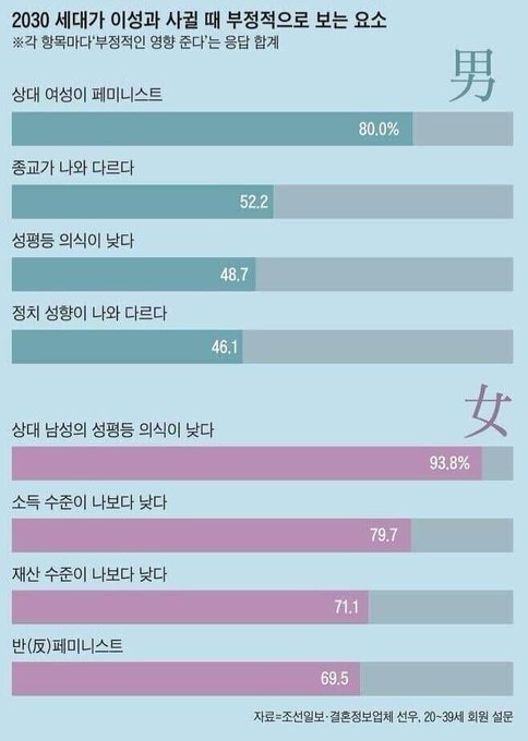 작성자주4일제근무 작성시간 24.05.11 성평등의식이낮다랑 상대여성이 페미니스트이다랑 어떻게 같은 선상에 놓일수있지? 정반대의 개념인데 지들이 뭔말을 하고는 있는지 알고는있나?