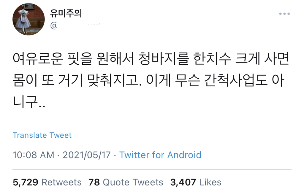 [스크랩] [흥미돋]여유로운 핏을 원해서 청바지를 한치수 크게 사면 작성자초장없는 브로콜리|작성시간24.05.11|조회수82,801 목록 댓글 21 글자크기 작게가 글자크기 크게가 출처 : https://twitter.com/yumismm/status/1394097531219447808?s=21 다음검색 스크랩 원문 : *여성시대* 차분한 20대들의 알흠다운 공간 현재 게시글 추가 기능 열기 북마크 공유하기 신고 센터로 신고 댓글 댓글 21 댓글쓰기 답글쓰기 댓글 리스트 작성자건전한 배틀태그 | 작성시간 24.05.11 ㅅㅂㅋㅋㅋㅋ 새만금바디 빡취네 진자 작성자호놀룰루다다 | 작성시간 24.05.11 알겠다구요... 숨 막혀도 입을게요.. 작성자돈쓰는거 | 작성시간 24.05.12 내가 사업중이었다니.. 작성자tktk | 작성시간 24.05.12 간척사업 ㅋㅋㅋㅋㅋㅋ 작성자지금나를개쪼다같다고생각한거죠 | 작성시간 24.05.12 역시 나만 그런게 아니었어 댓글 전체보기