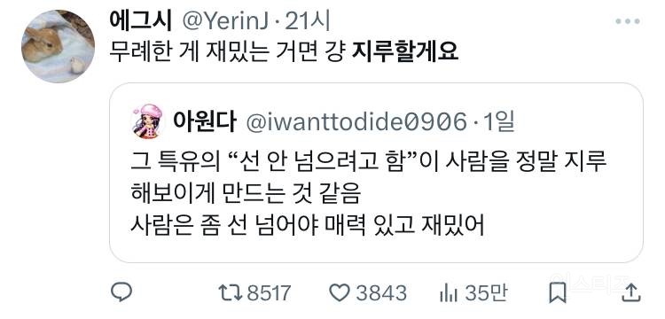 작성자와이파이비번 작성시간 24.05.13 ㅋㅋㅋㅋㅋ주변에 자기 선 넘을락말락 장난한다고 자랑하듯이 말한 사람있는데 선 잘넘음.. 무례할때도 많아서 피곤함
