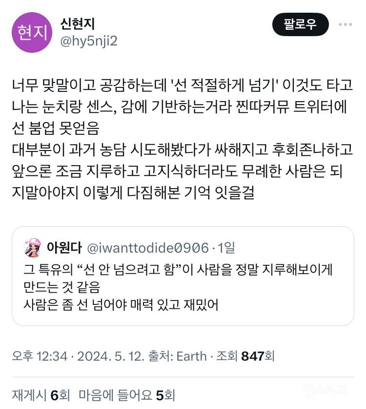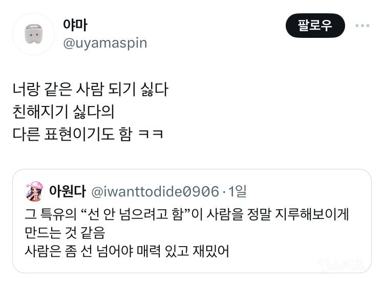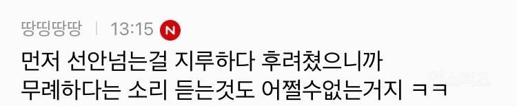 작성자도곧동 작성시간 24.05.13 선이라는건 정말 개인적인거라 다양한 의견이 나오는거같음 퍼스널한부분인것도 있고 최소한의 도덕기준일때도 잇으니 근데 나도 원글 이해하는게 보통 친해지려면 그 선..? 사회적 라인을 넘어서 다가가는 과정이 필요해서 저런말 한거같음 어느정도 공감