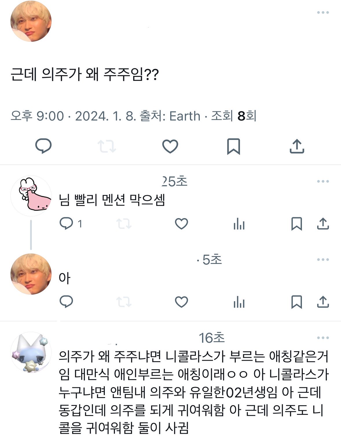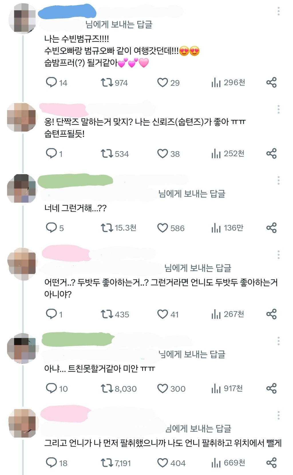 @@@가 ☆☆ 아들이라니 뭐니 이제 좀 그만하세요 그쪽 최애가 노래를 얼마나 잘하는진 모르겠는데 ☆☆아들 운운하는거 보기 안좋아요 ☆☆노래 좋아하는 팬으로써 기분도 안좋고요. 현실을 사세요. ☆☆도 모르게 가족을 만들어 버리네