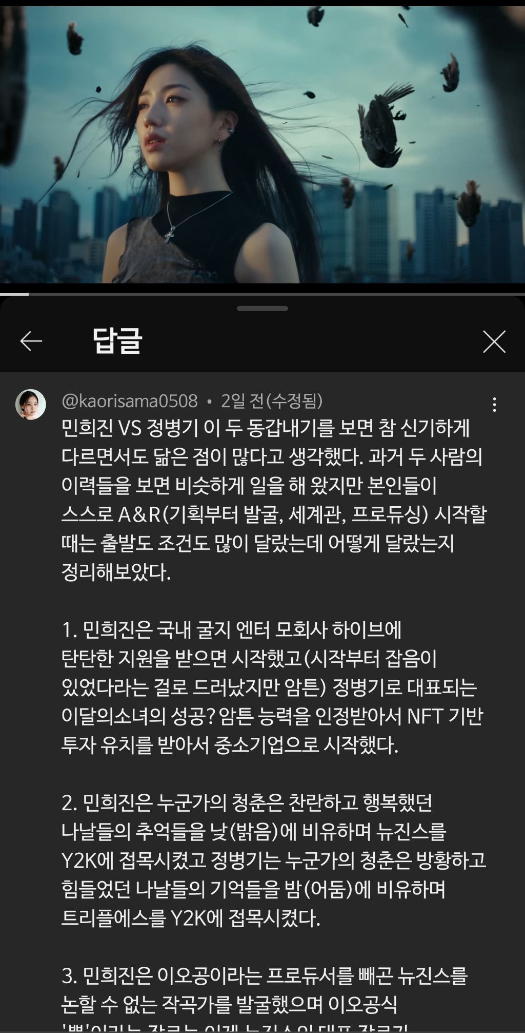 6. 민희진은 앞으로 어떻게 될지 모르겠지만 뉴진스만큼은 꼭 민희진의 손을 계속 거쳤으면 좋겠다.