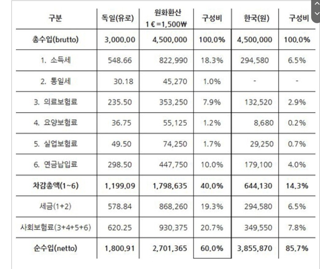 [독일 vs 한국 450만원 받았을시 실수령액 비교]