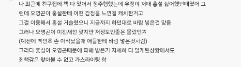 본문 내용이 백인호보다 홍설에 훨씬 초점되어있는건데 가스라이팅보고도 가스라이팅 관련은 말 없고 백인호만 보는게 이글 요점이 아니라고 말하고싶은건데