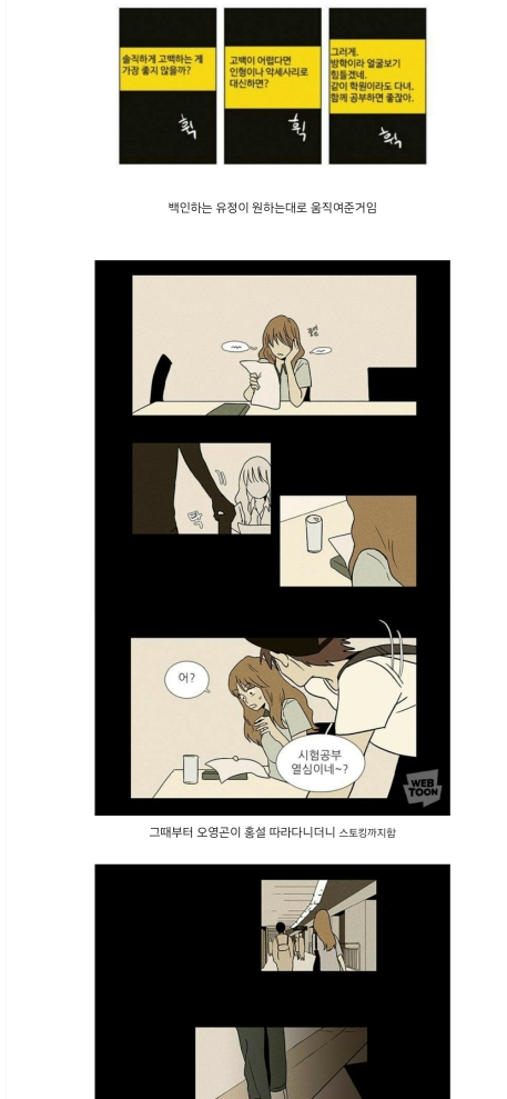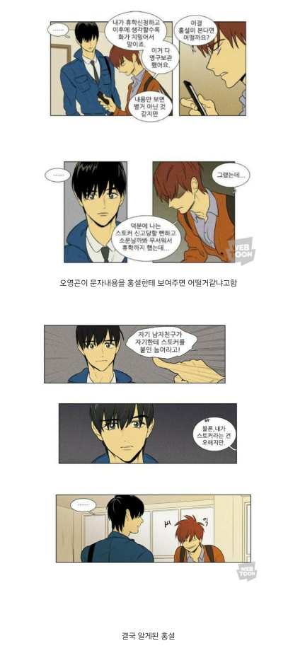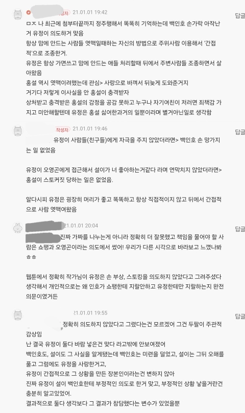 그래서 정설이 우리둘이 예민했네 서로 거슬렸다=눈에드는 서사로 쌓았고(봄비) 여기서 관점 갈리는 독자끼리 싸우고 난리남ㅋㅋㅋ그게 유정 백인호로 싸운거 더큼 럽라보다 나도 나이먹어서 싸울힘없어졌지만 맨날 메인커플 패는거 서브팬몰이도 그만 좀해라ㅜㅜ백인호탈모와서 그 팬 떨어진지오랜데 그리고 염불외서 치인트 오피스물 만들어달라는데 갑질미화물 보고싶냐고요 유정이랑 회사임원 잠깐나온거보면 캠퍼스 로맨스로 두는게 나음......유정보다 더 빻아도 순정이다 순애다 이런남캐 많은데 얘네만 이런 이야기나오는거고 좀 생각해봐야함ㅋㅋㅋㅋㅋ