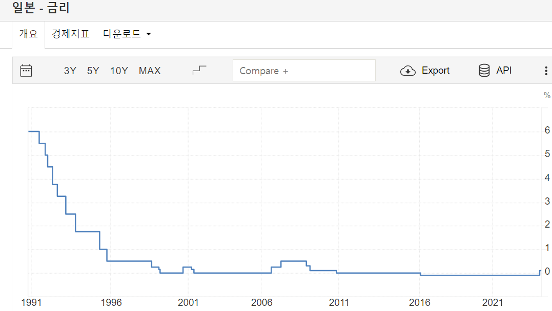 1991년에 6%였던 일본기준금리가 급격히 내려서 1996년에는 0.5%가 된다
