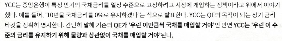 ycc정책은 정해진양이 없고 중앙은행이 자기가 정한 채권가격이 될때 까지 무제한적으로 채권을 매입하는 정책으로