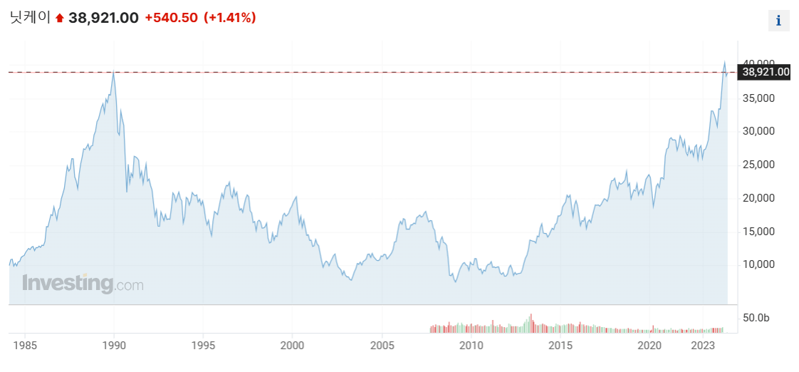 그러면서 일본에서 자산버블이 일어났고 그자산버블이 1990년대 초반에 무너지기 시작하면서 잃어버린 30년을 맞게된다