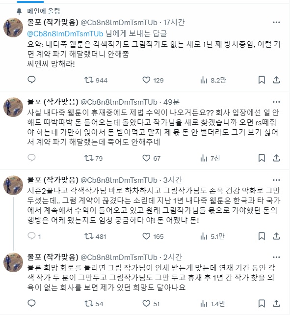 [기타]작품이 플랫폼에서 내려가면... 그 작품에 2년 혹은 그 이상 시간을 바쳐 작업한 모든 작업자들의 수익도 공중분해됩니다.
