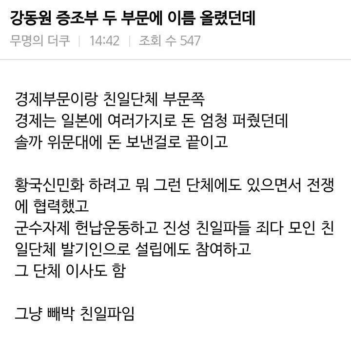 작성자영일쿤 작성시간 24.05.21 근데 강동원 어렷을때 집안 형편 안 좋앗잖아ㅠ 돈 없어서 유치원 가기도 힘들엇고 옷도 누나가 양보해서 사입엇다햇음... 나중에 형편 나아진 거는 아버지가 회사에서 일 잘하셔서 조기 승진하셔서 그렇다고 들엇음 그런거 보면 몰랏던 거 같긴함... 본인이 사죄하기도 햇고 이후에도 진보성향 행보 보여줘서 난 걍 그렇구나 싶음 물론 비판하는 여시들 의견 무조건 이해감!!! 아래 링크는 맥스무비가 강동원 친일파 관련 오보 정정하는 기사임.. 저번에 핫플 떳을때 가져올까 말까 고민햇는데 가져와봄(1급 어쩌구하는거랑 위안부 창설자다 그건 다 맥스무비가 팩트 없이 한 헛소리임) 진짜 다시 한번 말하지만 당연히 친일파 후손인거 욕 쳐먹을만한 거 맞고 이에 관련 비판하는 여시 의견 모두 다 맞다고 생각해