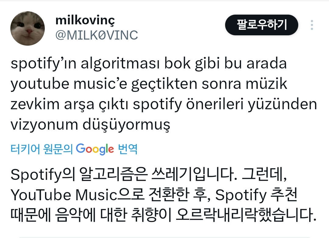 스포티파이 알고리즘 추천곡 때문에 취향이 망가졌다는 인용