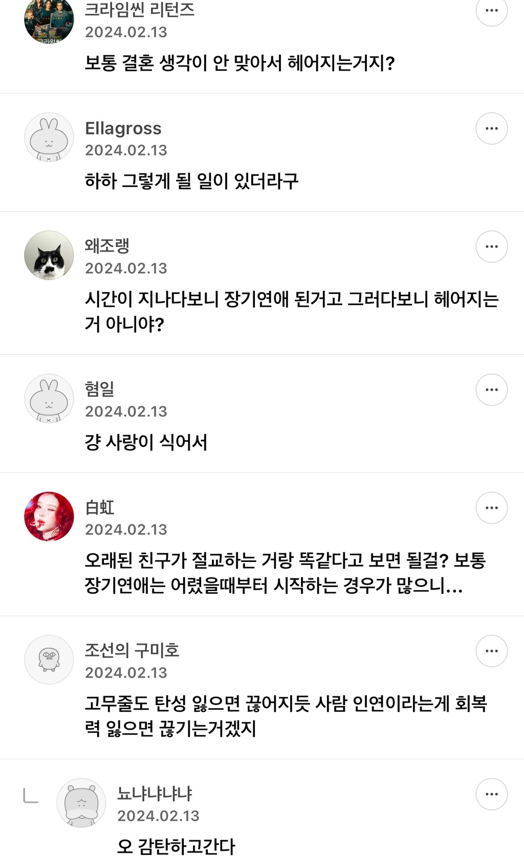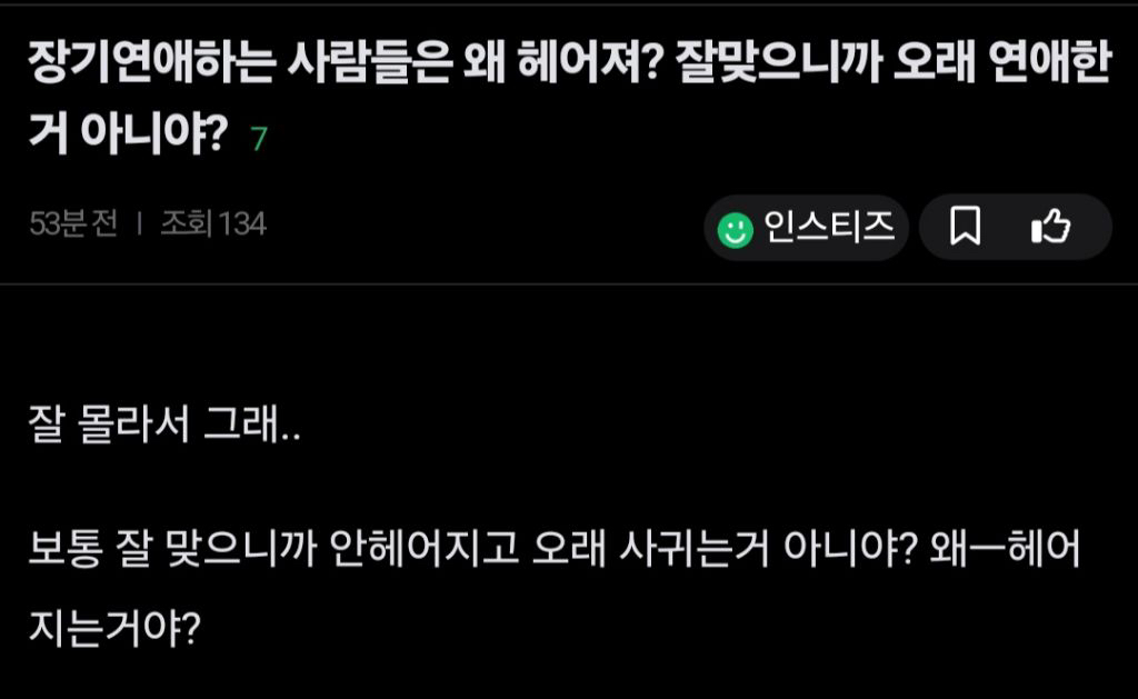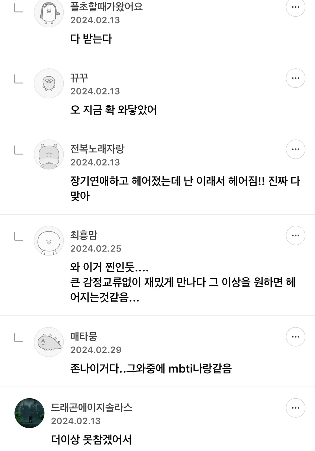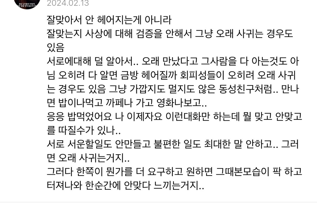 [흥미돋]장기연애하는 사람들은 왜 헤어져? 잘맞으니까 오래 연애한거 아니야? (+댓추가) 작성자패기있게|작성시간24.05.23|조회수37,421 목록 댓글 14 글자크기 작게가 글자크기 크게가 출처 : 여성시대 체리밭https://m.cafe.daum.net/subdued20club/ReHf/4769891?svc=cafeapp장기연애하는 사람들은 왜 헤어져?출처 인스티즈m.cafe.daum.net 다음검색 현재 게시글 추가 기능 열기 북마크 공유하기 신고 센터로 신고 댓글 댓글 14 댓글쓰기 답글쓰기 댓글 리스트 작성자쁨벙잉 | 작성시간 24.05.23 두번 해봤는데1번남 현실적인 이유(계속 공시 떨어짐)2번남 흐린눈하다하다 안되서 헤어짐 이었슴다^^ 작성자샥쇽샥쇽 | 작성시간 24.05.23 장기연애는 귀찮아서 못헤어지는거...나한테 너무 맞춰져있거든 작성자소금빵좋아 | 작성시간 24.05.23 결혼하재ㅡㅡ 싫어요 작성자주말만 기다리는 사람 | 작성시간 24.05.23 그냥 시간 흐르다보니 장기연애였던 거.. 작성자12374759336 | 작성시간 24.05.24 잘 맞는 거랑 사랑은 별개라서 댓글 전체보기