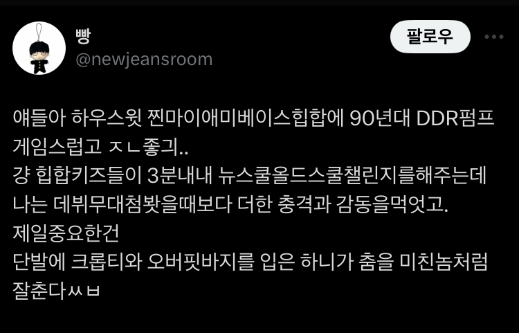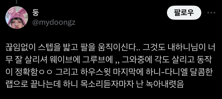 [흥미돋]오늘 나오는 뉴진스 신곡 How sweet 무대 먼저 본 팬들 반응.twt 작성자bubble gumm|작성시간24.05.24|조회수27,044 목록 댓글 177 글자크기 작게가 글자크기 크게가 출처: 여성시대 (bubble gumm)오후 1시에 음원 발매, 4시 뮤비 공개✨미리 음악방송 사전녹화 간 팬들의 후기임힙합 + 신남 + 빡센 춤 조합인듯 다음검색 현재 게시글 추가 기능 열기 북마크 공유하기 신고 센터로 신고 댓글 댓글 177 댓글쓰기 답글쓰기 댓글 리스트 작성자확률싸움 | 작성시간 24.05.24 하 나 진짜 해인이 아픈거 너무 속상하다 컨셉이랑 진짜 찰떡이였을거같은데 ㅜㅜㅜㅜ 하 작성자Leonardo DiCaprio | 작성시간 24.05.24 개가티기대 작성자킵고잉킵고잉 | 작성시간 24.05.24 개갓티기대중 작성자이상과 허상 | 작성시간 24.05.24 기대된다ㅠㅜ 작성자방귀대장뿡삥빵 | 작성시간 24.05.24 무대 압도적기대중 댓글 전체보기