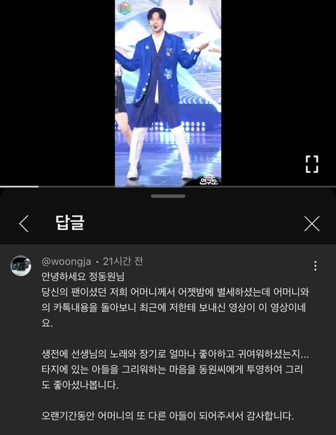 유튜브에 달린 정동원 팬이였던 어머니가 보내준 마지막 영상이 자기 영상이라는 댓글보고 감동받았다고
