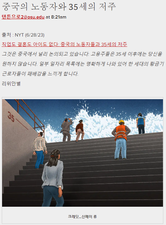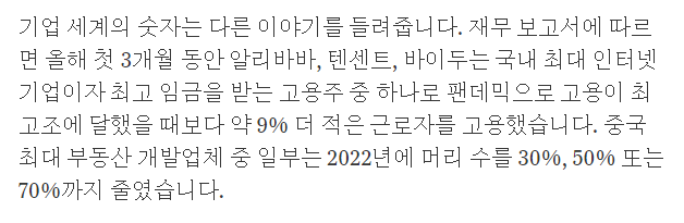 저것 언론에 잘나오지 않는데 중국인들 사이에서는 엄청 심각한 문제라든데 개발자들도 40세 넘으면 짤린다고 이제 겨우 가정 이루고 중산층으로 성장해야 하는 계층이 저렇게 고꾸라지고 단순 노무로 빠져버린다고