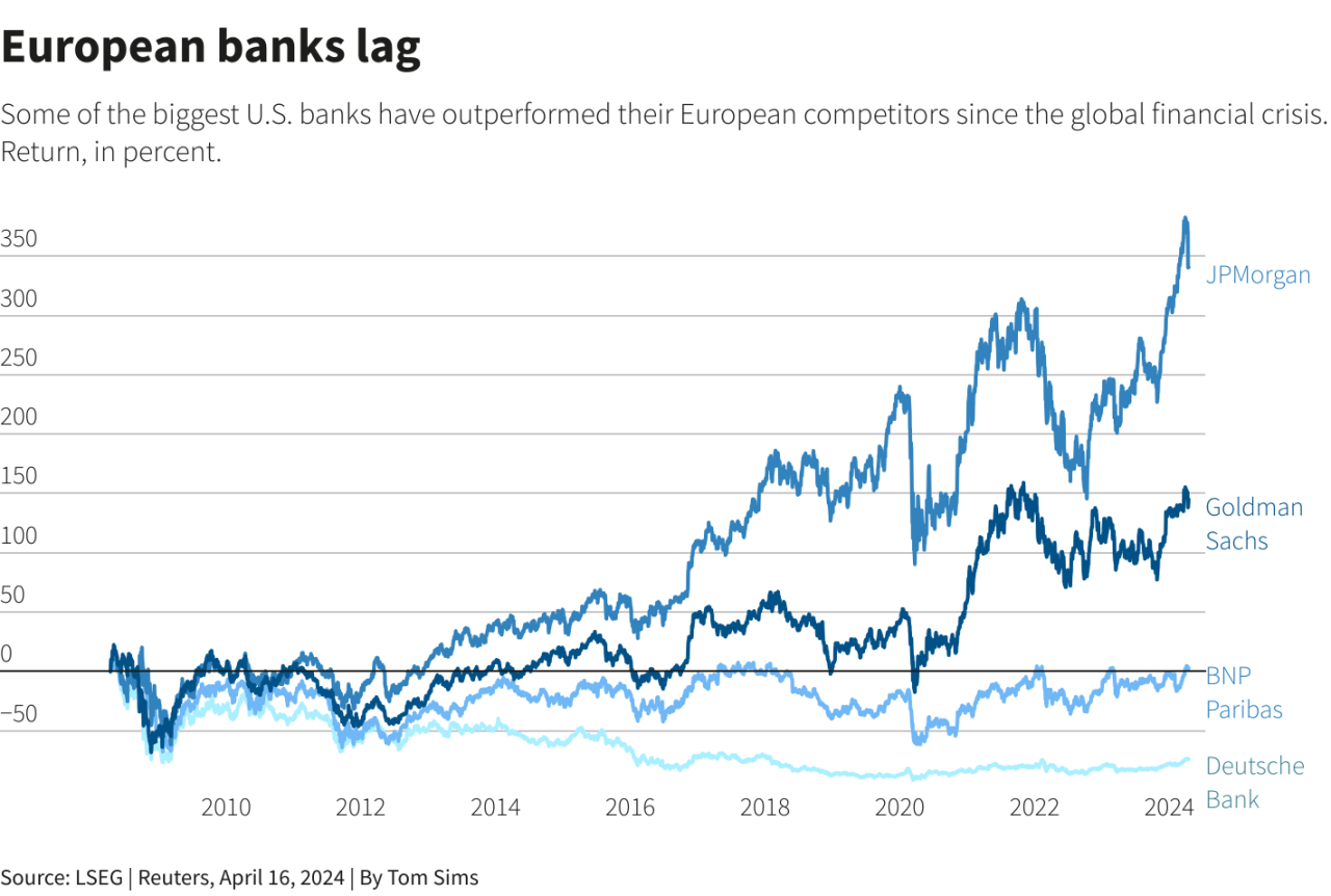 그 정도는 심각해서 도이체 방크는 고점은 커녕 10년전도 회복하지 못하고 저점을 갱신하네 마네 하는데 미국 은행들은 년마다 고점을 최근 돌파중.
