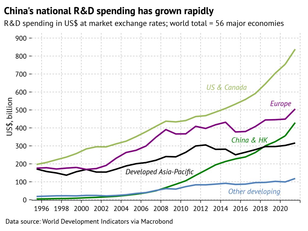 [ 북아메리카 vs 유럽 vs 중국 vs 한국 일본등 선진국 아시아 기술 개발 투자액 : 유럽과 한국 일본은 정체고 미국 중국만 상승중 ]