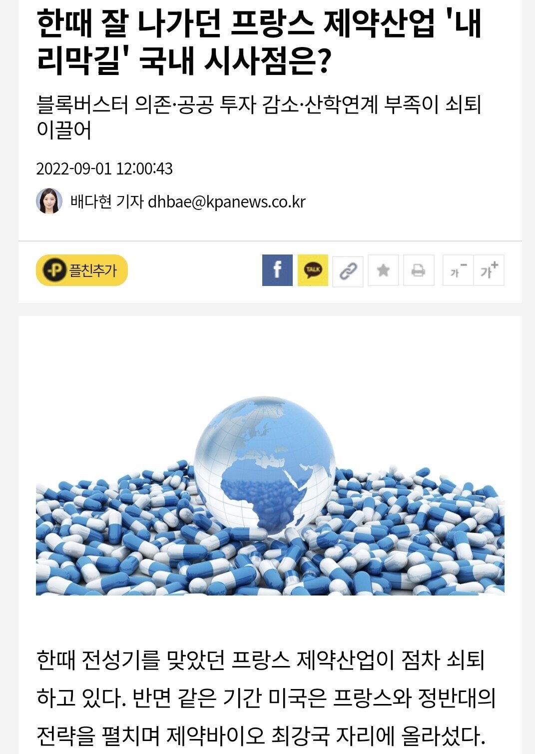 1980년대 90년대만해도 미국보다 앞서던 프랑스를 위시로한 유럽 제약산업은 미국의 제약사인 일라이 릴리 시총이 프랑스 최대 제약사 사노피의 6배 독일 최대 제약사중 하나인 베이어의 34배라는 충격적 수치로 나타나고 있음.