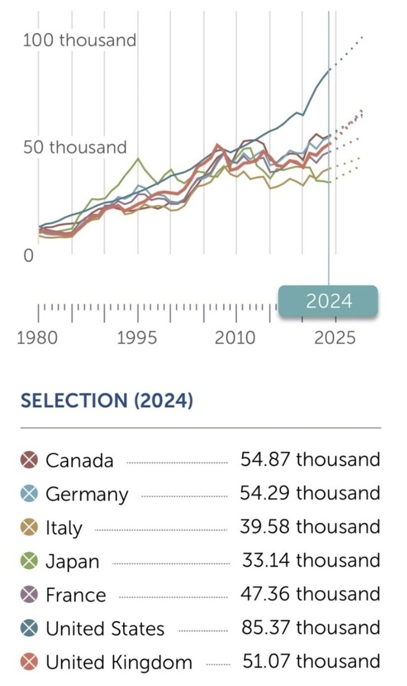 특히 1995년 이후 일본은 30년간, 그리고 2008년 이후 유럽은 거의 16년간 정체중인데 미국은 2020년대 후반 10만불까지 찍으며 인구 3억 4000만이 넘는 국가가 인구 500만에 불과한 노르웨이 소득에 근접해가고 있음.