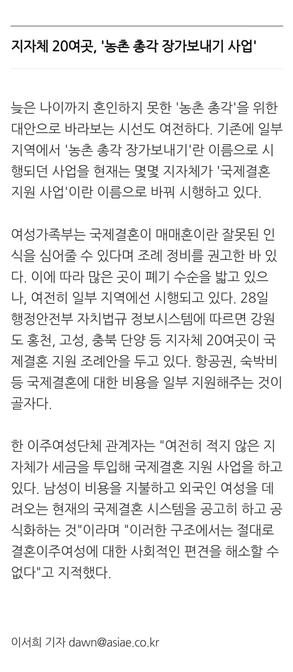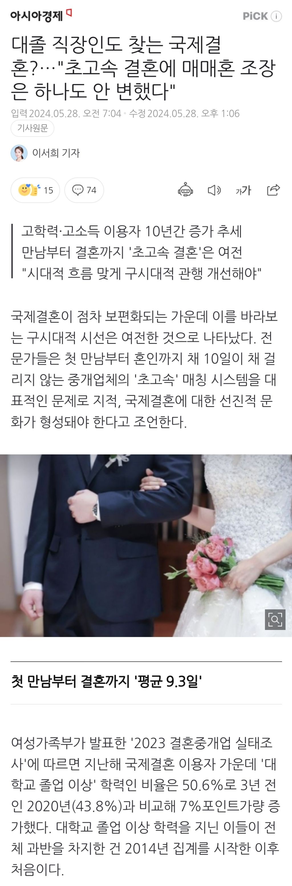 [여시뉴스데스크]대졸 직장인도 찾는 국제결혼?…"초고속 결혼에 매매혼 조장은 하나도 안 변했다" 작성자천리길|작성시간24.05.28|조회수1,254 목록 댓글 0 글자크기 작게가 글자크기 크게가 출처: https://naver.me/GdiqkQ8x대졸 직장인도 찾는 국제결혼?…"초고속 결혼에 매매혼 조장은 하나도 안 변했다"국제결혼이 점차 보편화되는 가운데 이를 바라보는 구시대적 시선은 여전한 것으로 나타났다. 전문가들은 첫 만남부터 혼인까지 채 10일이 채 걸리지 않는 중개업체의 '초고속' 매칭 시스템을 n.news.naver.com전문 출처로중략 다음검색 현재 게시글 추가 기능 열기 북마크 공유하기 신고 센터로 신고 댓글 댓글 0 댓글쓰기 답글쓰기 댓글 리스트