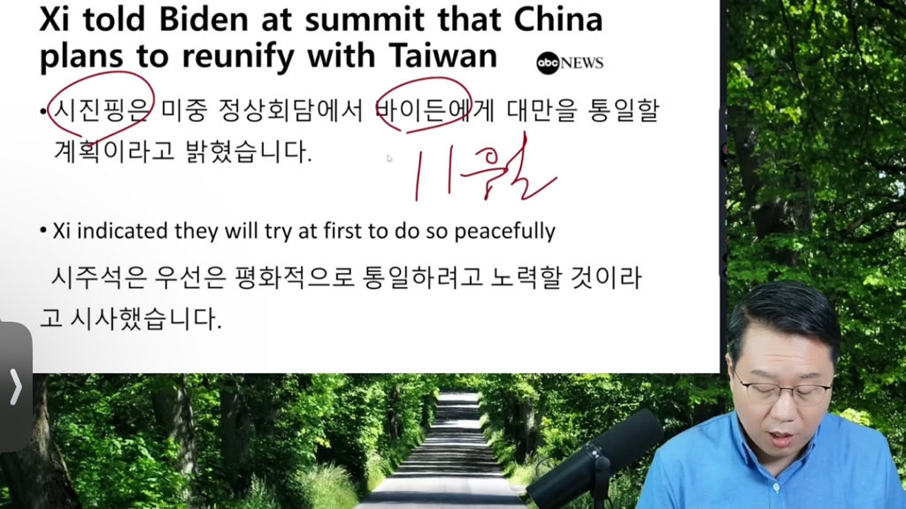 작년 11월 미중 정상회담에서 시진핑이 바이든에게 ‘평화적‘으로 통일할 거라 함