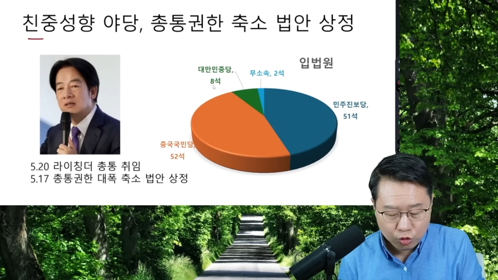 근데 지금 집권당인 민주진보당(51)보다 야당이자 친중 성향인 중국국민당(52)과 중도인 대만민중당(8)이 의석수가 더 많음