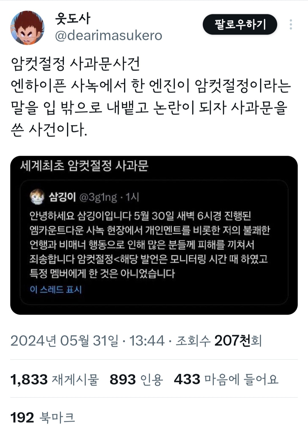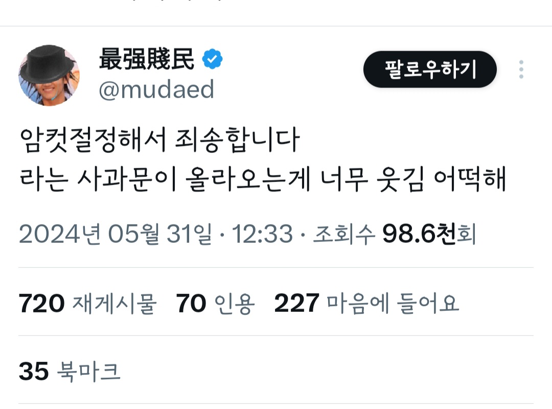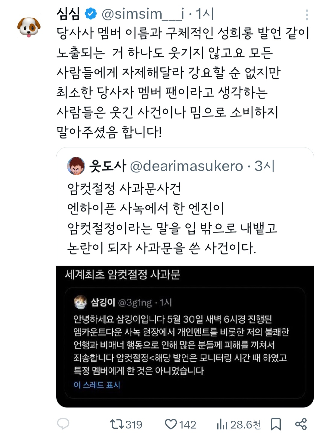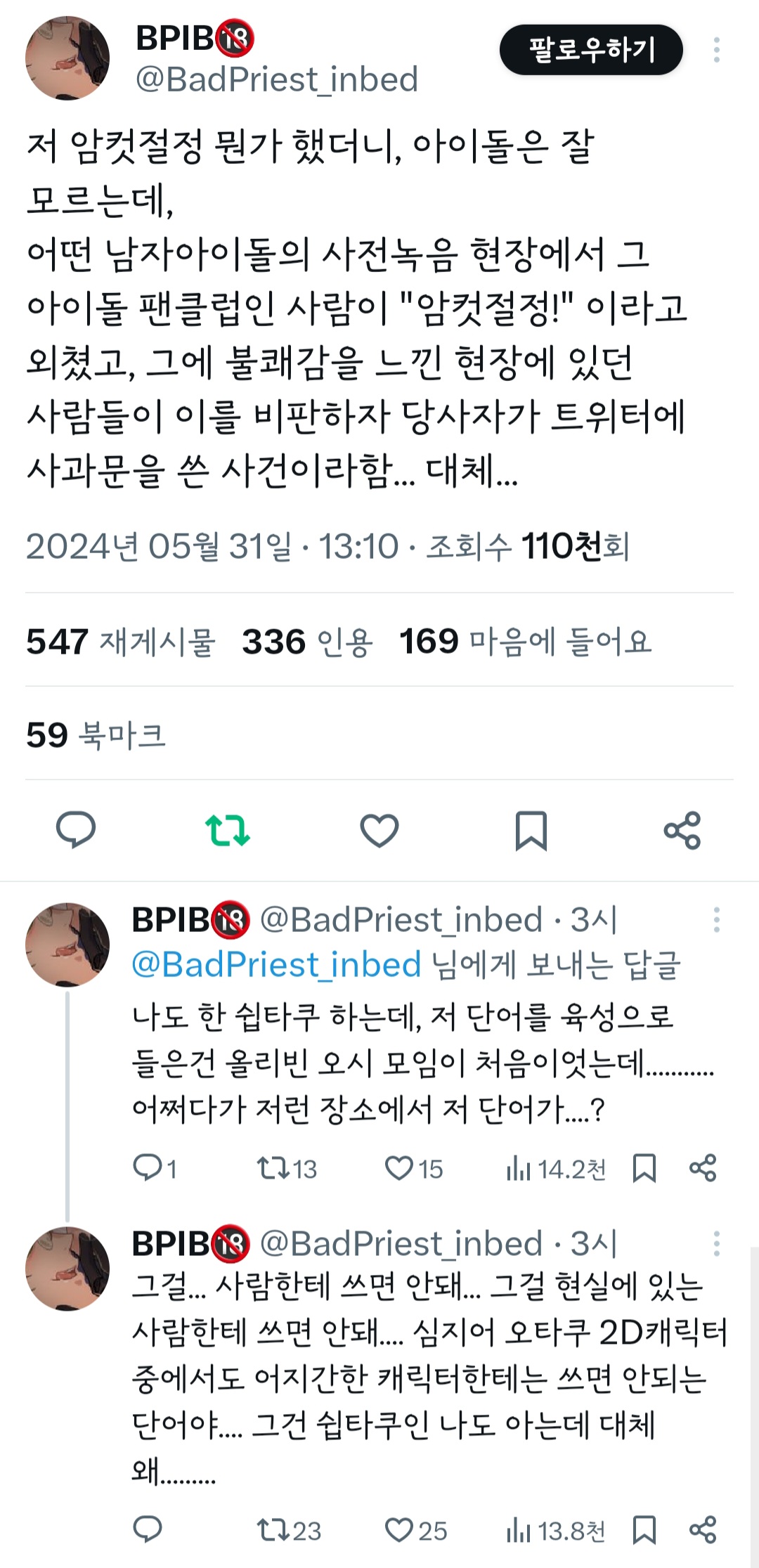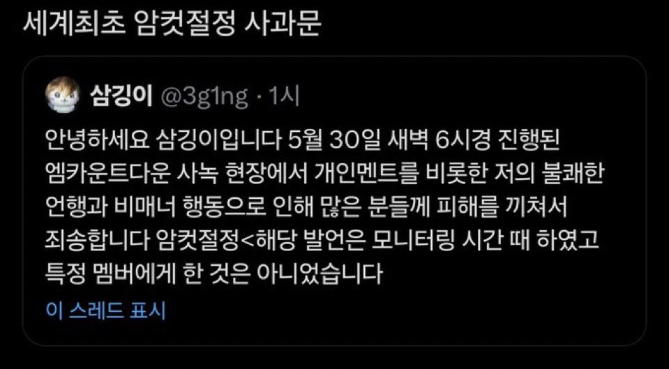 [흥미돋]암컷절정 사과문 사건 작성자이우인.|작성시간24.05.31|조회수57,200 목록 댓글 250 글자크기 작게가 글자크기 크게가 출처: https://twitter.com/dearimasukero/status/1796402436644716660?t=w98anVU1cTgBi_K0VSvdSg&s=19 다음검색 현재 게시글 추가 기능 열기 북마크 공유하기 신고 센터로 신고 댓글 댓글 250 댓글쓰기 답글쓰기 댓글 리스트 작성자EDG 아펠리오스 | 작성시간 24.06.01 예..? 작성자둥근달 | 작성시간 24.06.01 남자가 후장박혀서 가는거래수컷 성희롱하는건데도 여혐이 필요하나?? 수컷절정으로 바꿔 ㅈ 같으니께 작성자희않하뇌 | 작성시간 24.06.01 여혐오진다 작성자문구점 | 작성시간 24.06.01 에이씨발 별 좆같은 말 다 알아야 하네 작성자쉘던 쿠퍼 | 작성시간 24.06.03 아 씨발 존나 혐오지내 댓글 전체보기