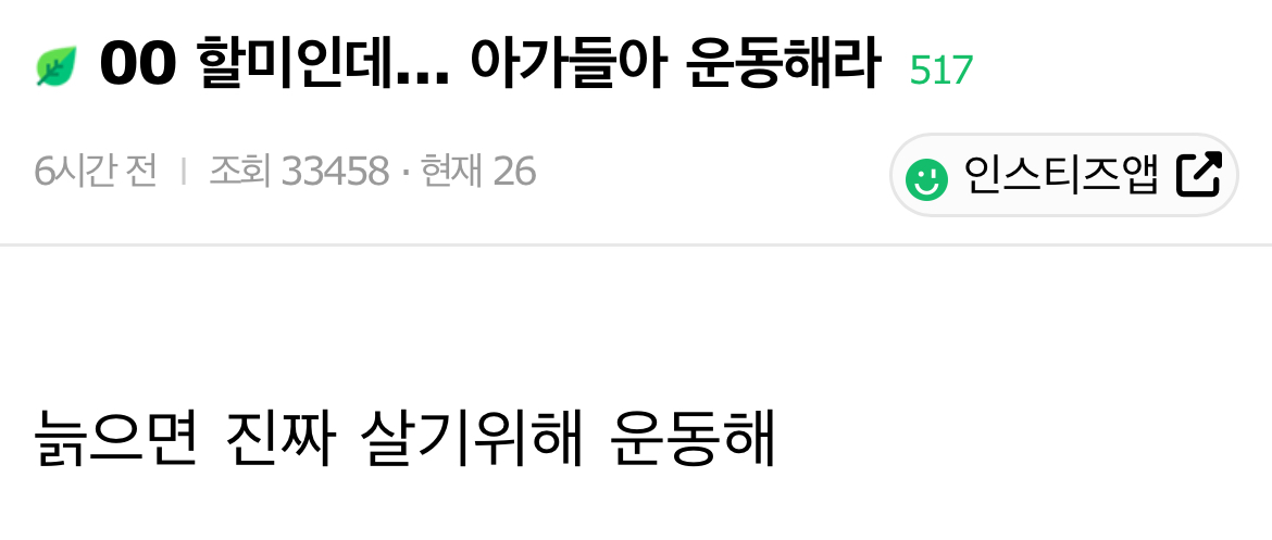 [흥미돋]00 할미인데... 아가들아 운동해라 작성자설리야|작성시간24.06.01|조회수9,120 목록 댓글 46 글자크기 작게가 글자크기 크게가 출처: 여성시대 설리야https://www.instiz.net/name/59109567[잡담] 00 할미인데... 아가들아 운동해라 - 인스티즈(instiz) 일상 카테고리늙으면 진짜 살기위해 운동해www.instiz.netㅋㅋㅋ?? 다음검색 현재 게시글 추가 기능 열기 북마크 공유하기 신고 센터로 신고 댓글 댓글 46 댓글쓰기 답글쓰기 댓글 리스트 작성자사이다한입 | 작성시간 24.06.02 아 진짜 뭐하냐.. 작성자ISTJ/INTJ | 작성시간 24.06.02 그려... 일찍 운동하면 좋지... 작성자웅앵앙 | 작성시간 24.06.02 깝치네 작성자걱정대신확신 | 작성시간 24.06.02 요새 30대 초중반 여자들이 스스로 늙었다고 하는 것도 짜증나는데 00년생은 또 뭐냐 작성자슉슉슉슉 | 작성시간 24.06.02 00이 나이라고 생각못하고 가려져 있는 어떤 말이 있는줄 알았네 ㅋㅋㅋㅋㅋㅋㅋㅋㅋㅋㅋㅋㅋㅋㅋㅋㅋㅋ ㅅㅂ; 댓글 전체보기