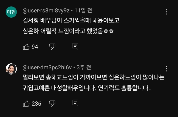 [흥미돋]심은하가 생각난다는 김혜윤 실물 작성자(닉네임).|작성시간24.06.01|조회수33,169 목록 댓글 70 글자크기 작게가 글자크기 크게가 출처: https://youtu.be/M1RT7rz70WE?si=DLuNh8z4FjpmTGhY심은하 같다는 반응 많아서 찾아봄그때그시절 심은하김혜윤뭔가 밝아진 느낌의 심은하 다음검색 현재 게시글 추가 기능 열기 북마크 공유하기 신고 센터로 신고 댓글 댓글 70 댓글쓰기 답글쓰기 댓글 리스트 작성자리셋해버리기 | 작성시간 24.06.02 맑다 맑아 작성자수 지 | 작성시간 24.06.02 와 진짜 닮았다 작성자행복하세욤 | 작성시간 24.06.02 이 장면 진짜 심은하 같았어 ㅋㅋㅋ 이미지 확대 작성자카챠카챠 | 작성시간 24.06.02 분위기 있는 으른 로맨스도 한번만 말아줬음 좋겠다 혜윤이ㅠㅠ 작성자돌아뿌리버럭시아스 | 작성시간 25.11.30 닮앗오 댓글 전체보기