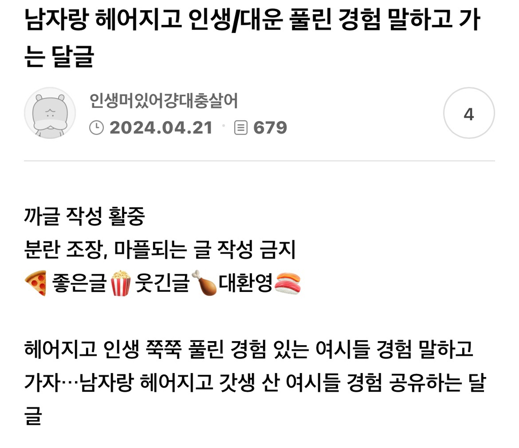 작성자춘식이는집순이 작성시간 24.06.04 대학생때부터 취준때까지 사귀던 남친있는데 헤어지고 공부에집중해서 자격증도 따고 취뽀함 ..