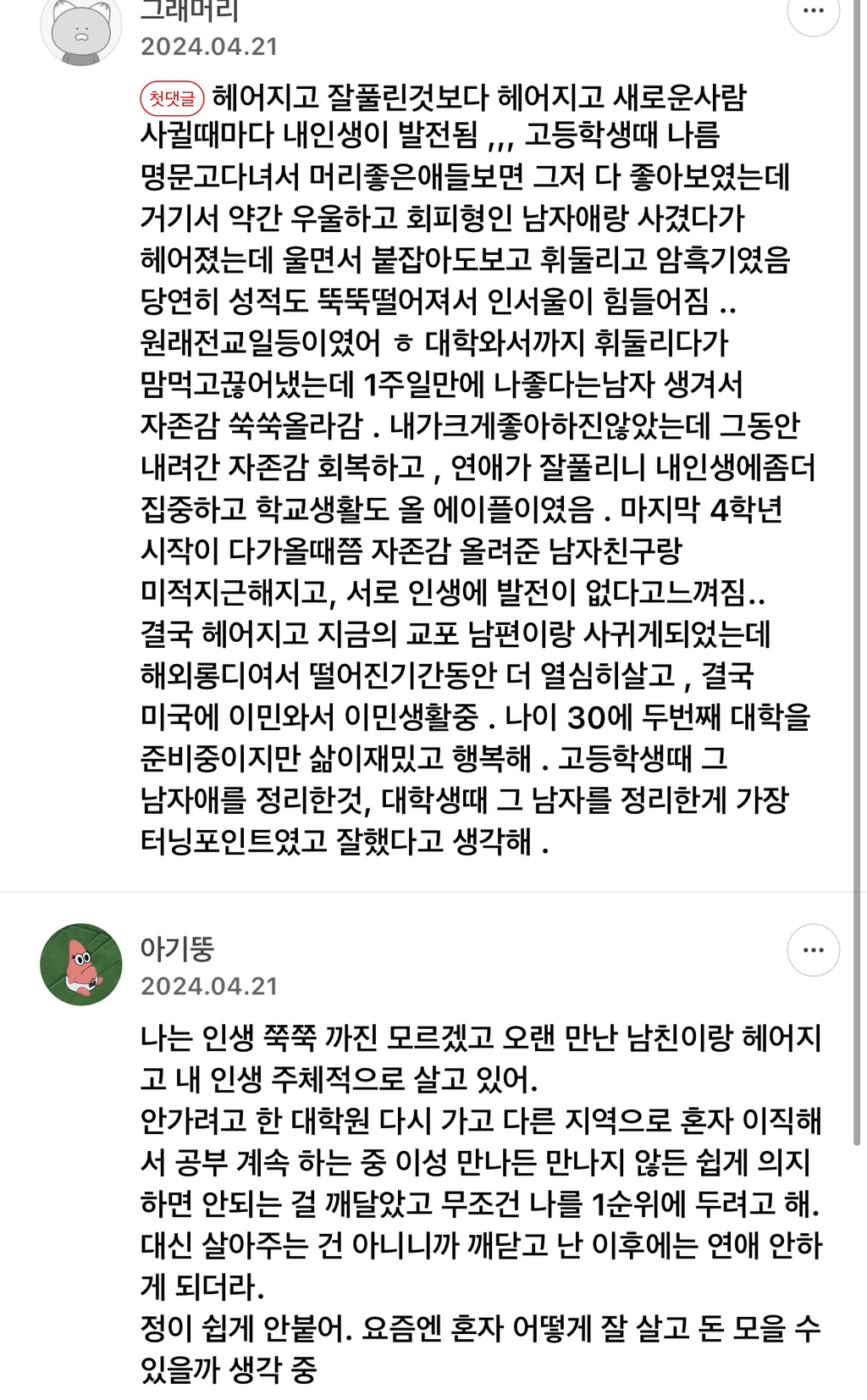 작성자용호초 작성시간 24.06.05 대학교 1학년때 구질구질하게 만나던 애랑 헤어지고 2학년때 과탑함ㅋㅋㅋㅋ 그냥 나한테 온전히 집중하게 되니 일이 잘 풀리더라