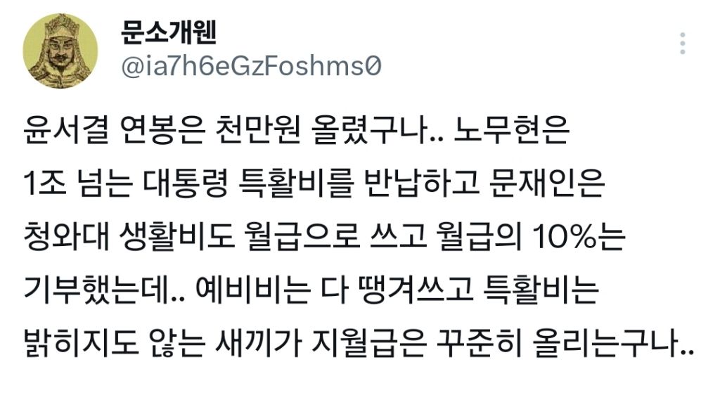 [스크랩] [여시뉴스데스크]윤석열 대통령 연봉 2023년 대비 약 천만 올랐다 작성자고앙유|작성시간24.06.06|조회수1,678 목록 댓글 16 글자크기 작게가 글자크기 크게가 나랏돈이 쌈짓돈이구나 ㅅㅂ 다음검색 스크랩 원문 : 이종격투기 현재 게시글 추가 기능 열기 북마크 공유하기 신고 센터로 신고 댓글 댓글 16 댓글쓰기 답글쓰기 댓글 리스트 작성자망그러진부앙단 | 작성시간 24.06.06 아니 ㅋㅋㅋ 작성자작성자1 | 작성시간 24.06.06 하는게 뭐있다고 연봉 쳐올려 작성자자색고구머 | 작성시간 24.06.06 욕심 많은 자의 비참한 최후를 기대한다. 작성자고양이는범새기갓지 | 작성시간 24.06.06 ㅋㅋㅋㅋㅋ자식도 없는 놈이 돈은 뭐 지옥가서 쓸라구 그러나 작성자일하기존.나.싫어요 | 작성시간 24.06.06 왜받는거지? 전혀 이해가 안되는데 숨쉬는데 돈내야할것같은데 댓글 전체보기