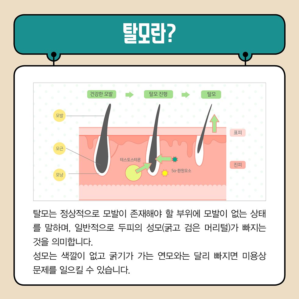 이 ’디하이드로테스토스테론‘ 이 모낭을 작게 만들고, 결국은 머리카락이 두피에서 탈락시키는 역할을 하는 만큼,