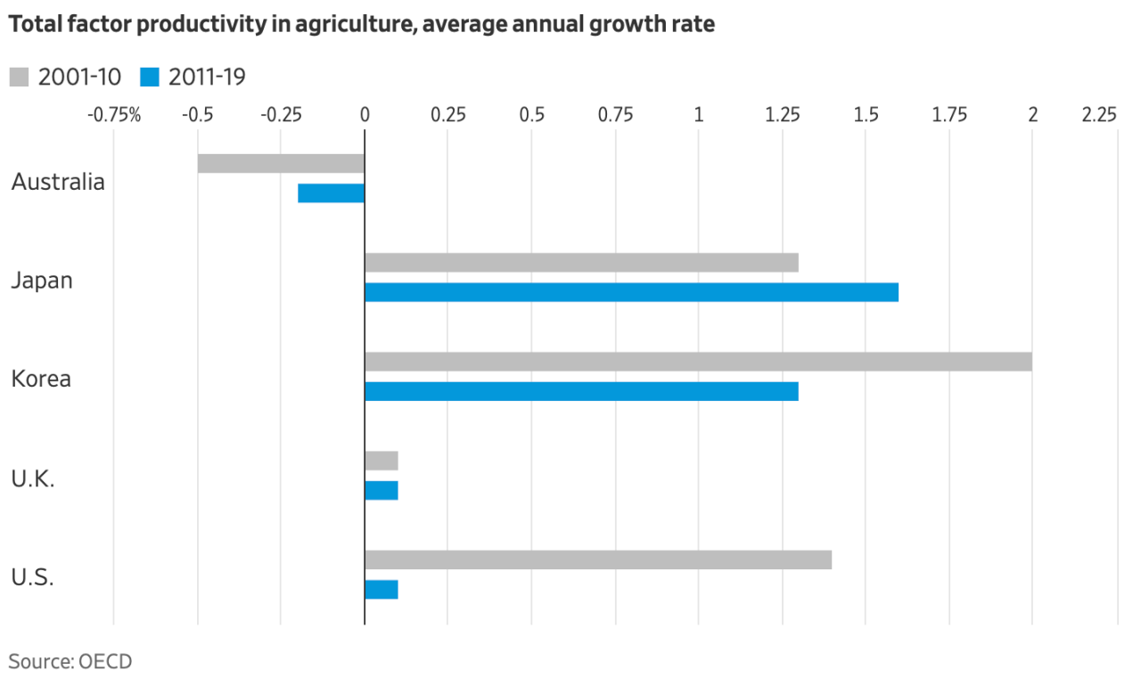 최근 몇 년 동안 선진국 전반에 걸쳐 노동생산성 증가는 부진했다. 미국과 영국의 농업 분야에서 생산성은 10년 이상 정체 상태다. 이민 정책이 더 엄격한 일본과 한국에서는 생산성이 연간 약 1.5% 증가(OECD 자료)했다.