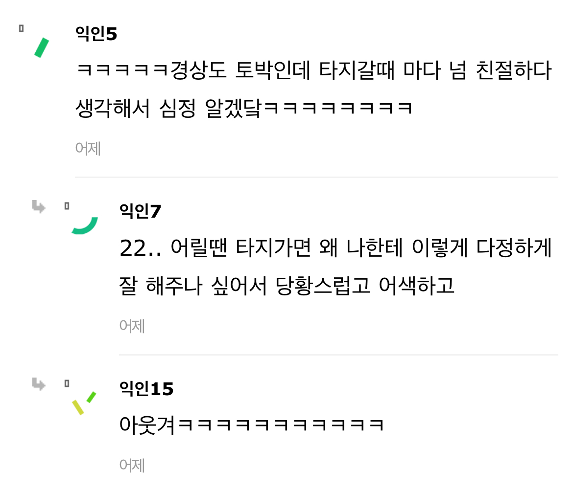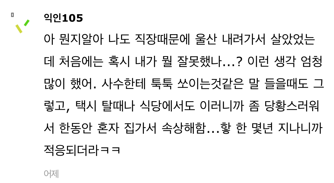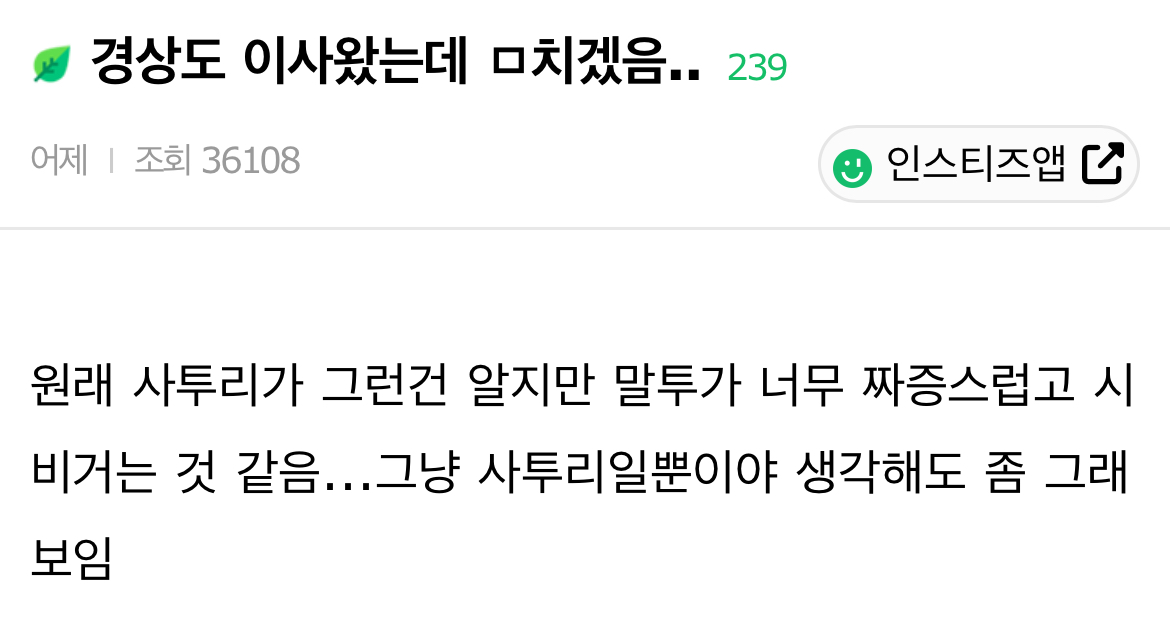 작성자공을네모안에넣어 작성시간 24.06.10 근데 경상도 억양이 쫌 그렇긴해.. 이건 진짜 살아야 익숙해지는거라 ㅠ 타지역사람들이 놀래는거 이해 가긴함ㅋㅋㅋ 근데 진짜 악의는 하나도 없음. 걍 >말투<가 그런거지 그 말투에 다른 숨겨진?의도나 그런건 아예 없어예🥹