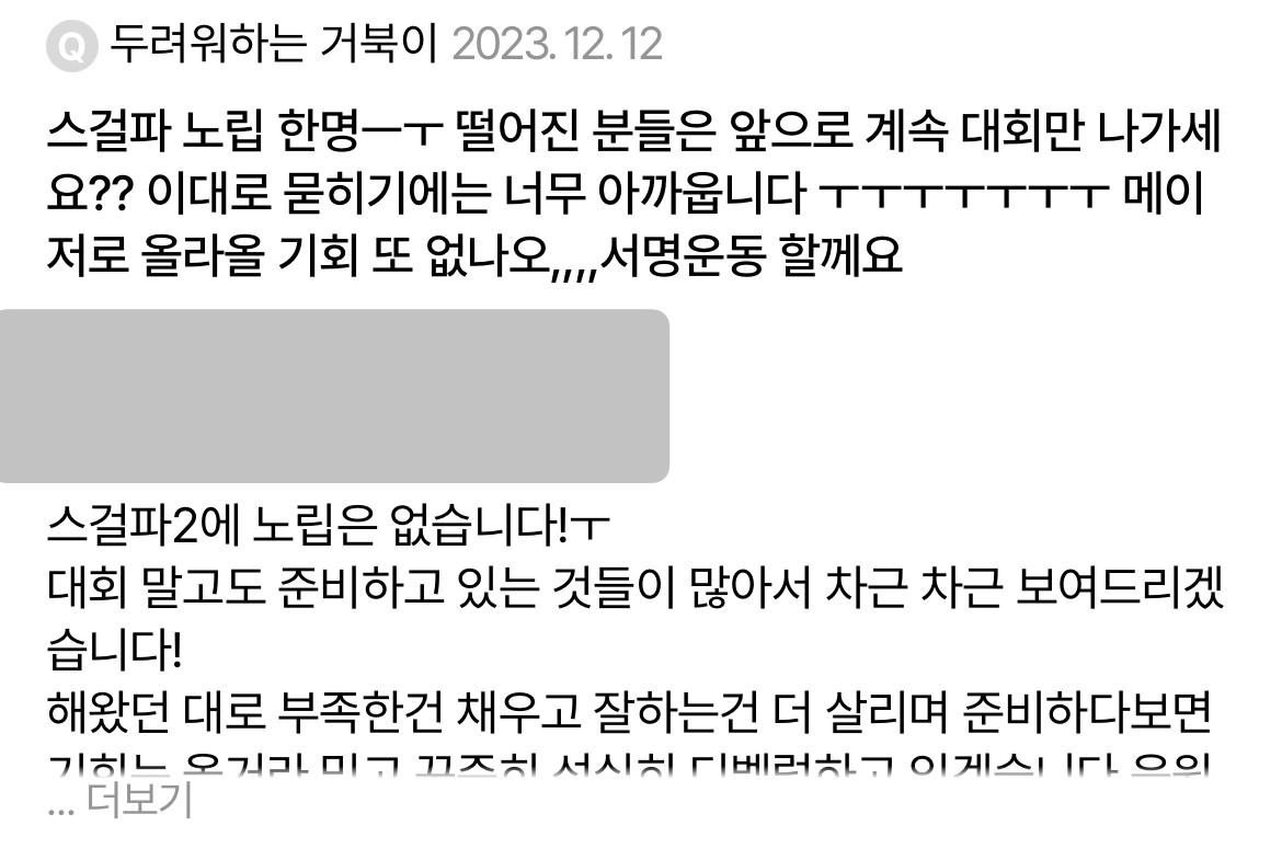 작성자쌉쌉파서블 작성시간 24.06.16 아니 아예 개인 자격만 뽑던가.... 크루를 불러와놓고 저러면 엌덕해ㅠㅠㅠㅠ