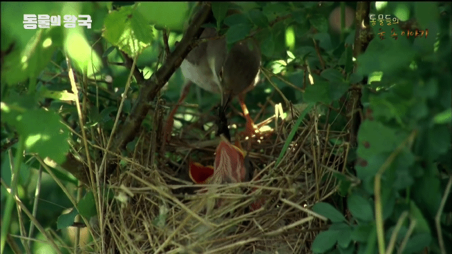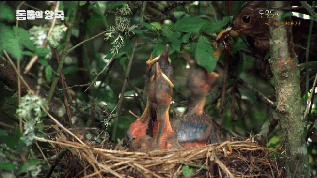 마침 먹이를 가져온 엄마를 향해 입벌리는 아기새들