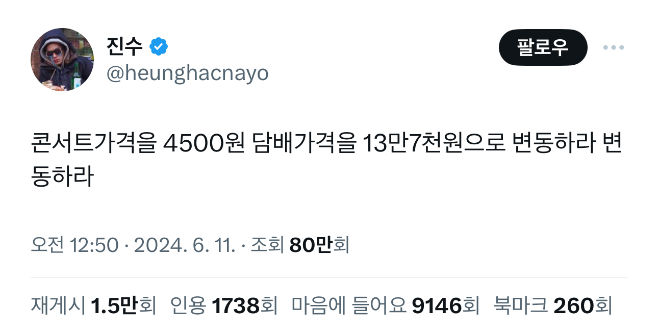 [흥미돋]콘서트가격을 4500원 담배가격을 13만7천원으로 변동하라 변동하라 작성자나프탈렌향|작성시간24.06.11|조회수9,052 목록 댓글 70 글자크기 작게가 글자크기 크게가 출처: https://x.com/heunghacnayo/status/1800193743578165759?s=46&t=v7QMmEln8v7WsADFKYn65gX의 진수님(@heunghacnayo)콘서트가격을 4500원 담배가격을 13만7천원으로 변동하라 변동하라x.com 다음검색 현재 게시글 추가 기능 열기 북마크 공유하기 신고 센터로 신고 댓글 댓글 70 댓글쓰기 답글쓰기 댓글 리스트 작성자침묵하는 순간 공범이 된다 | 작성시간 24.06.11 동이 작성자부산강쥐 | 작성시간 24.06.11 동삼백오십 작성자수신료의가치 | 작성시간 24.06.11 둘다 안하지만 동이 작성자벌벌코인 | 작성시간 24.06.11 덩이 작성자RWND | 작성시간 24.06.11 완전동이 댓글 전체보기