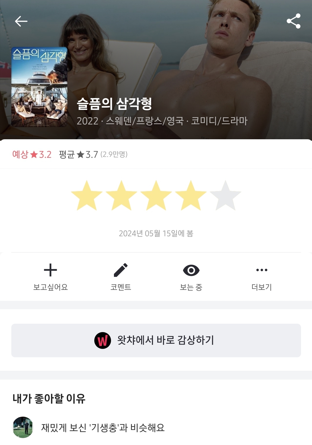 실제로 왓챠피디아에서 이 영화 기생충이랑 비슷하다고 추천해줌