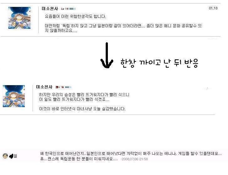 이 분위기가 17년도까지 이어짐 맞는 말 하는 게녀가 쳐맞던 심각한 분위기. 저떄만 저랬냐고? 요즘 다시 시작이야 ㄷㅋ 비롯 온갖 일빠사이트가 넘쳐나고 일본불매 여론을 비웃고 또 극보수싸이트 같은 정치적 이유로 조롱하고 날조하기도 하지.