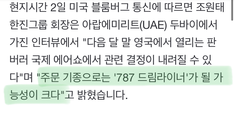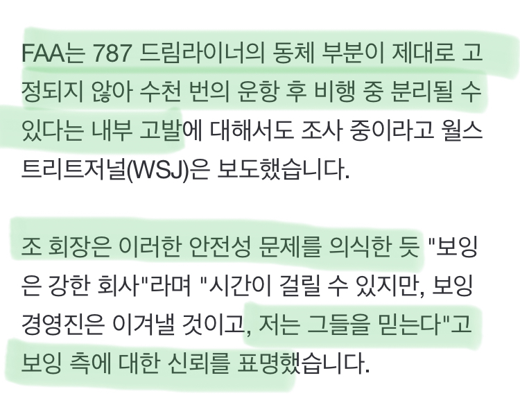 [여시뉴스데스크]"대한항공, 보잉 항공기 30대 구매"…잇단 사고로 안정성 우려 작성자(본인닉네임).|작성시간24.06.11|조회수2,103 목록 댓글 4 글자크기 작게가 글자크기 크게가 출처: https://n.news.naver.com/article/437/0000395442?sid=104에어버스꺼 사면 안되나..ㅜㅜ 다음검색 현재 게시글 추가 기능 열기 북마크 공유하기 신고 센터로 신고 댓글 댓글 4 댓글쓰기 답글쓰기 댓글 리스트 작성자팟럭파티 | 작성시간 24.06.11 사고 뉴스 잦던데ㅠㅠ 초초초 양품만 오길 작성자호당근마켓호 | 작성시간 24.06.11 미국에 합병 승인 받으려고 보잉꺼 사는건가?? ㅠㅜ 작성자룰로리 | 작성시간 24.06.11 근데 787만큼 좋은 비행기가 어딨다구... 787은 거의 사고 소식도 없었던거같은데 작성자Alex vause | 작성시간 24.06.11 공중...분리요....? 댓글 전체보기
