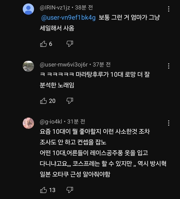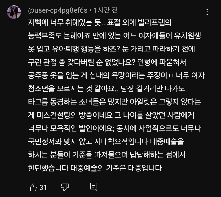 작성자호서거더 작성시간 24.06.14 뉴진스야 말로 10대 소녀 그 자체인데ㅋㅋㅋㅋ어이없네 구름 인형 어쩌고야말로 아저씨들 환상 속에 있는 소녀세요;;;몸만 십대고 얼굴이랑 사고는 다섯살인 설정 어디서 많이 봤는데!^^나 십대 때 잠들기 전 했던 상상은 썸남,인소 이런거지 뭔 구름위에;;