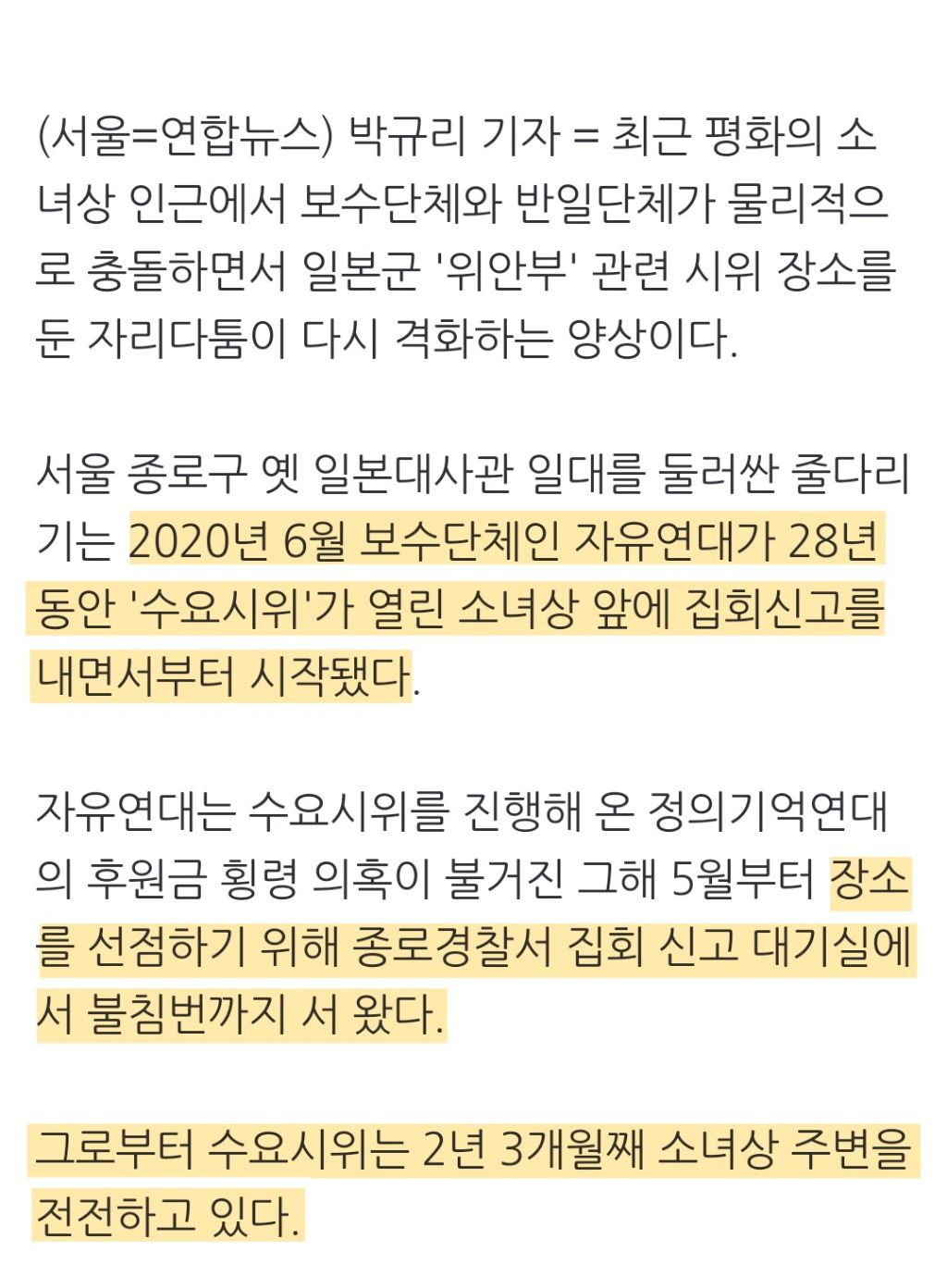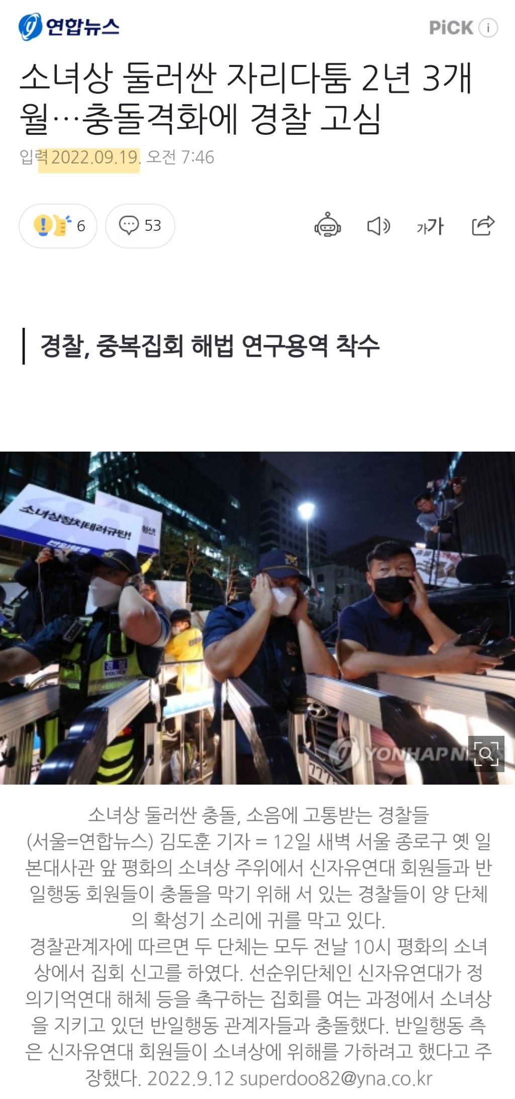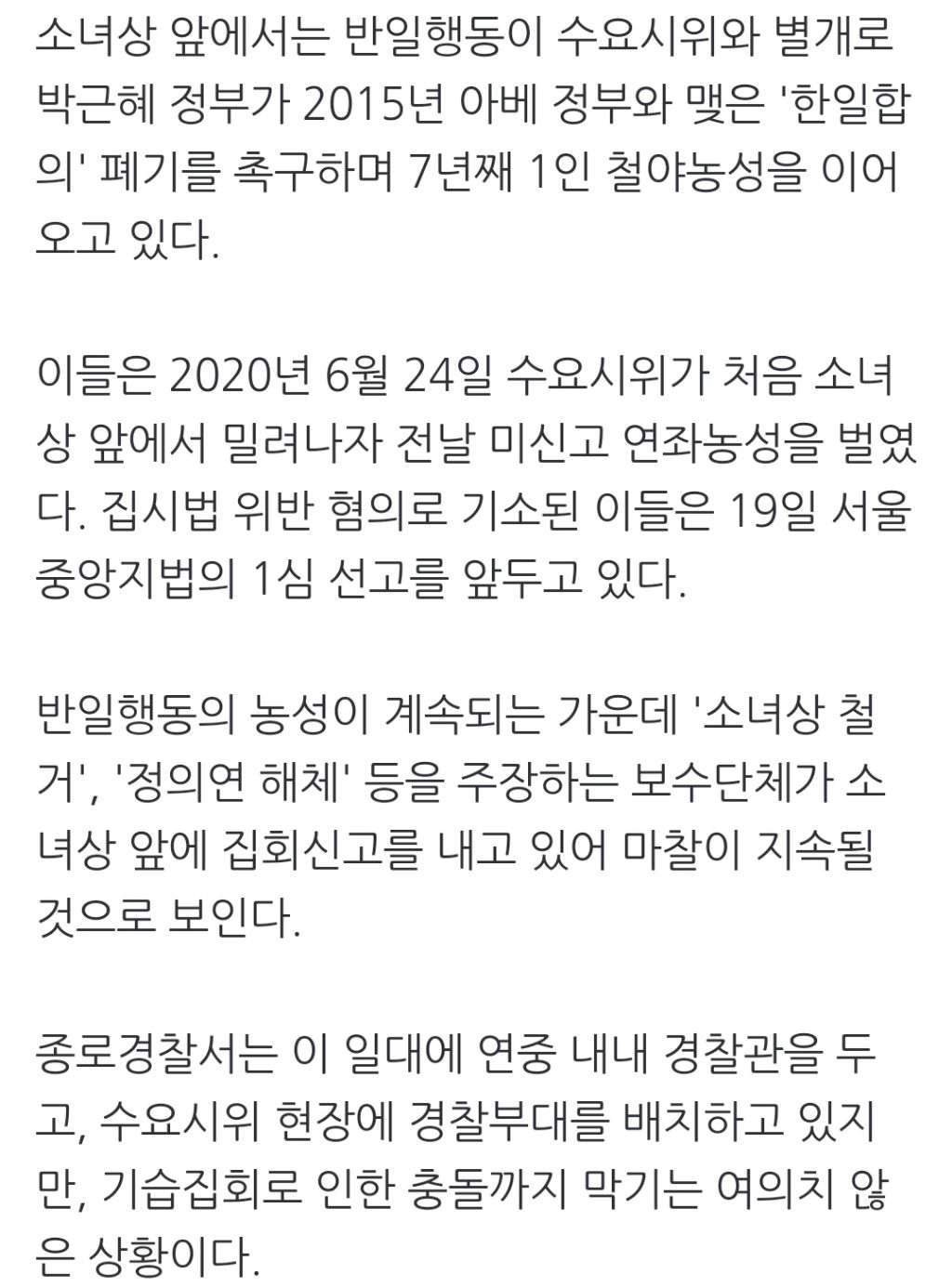 [스크랩] [여시뉴스데스크]소녀상 둘러싼 자리다툼 2년 3개월…충돌격화에 경찰 고심 (22.09.19) 작성자천리길|작성시간24.06.12|조회수359 목록 댓글 3 글자크기 작게가 글자크기 크게가 출처 : https://naver.me/IgNrFk8A소녀상 둘러싼 자리다툼 2년 3개월…충돌격화에 경찰 고심경찰, 중복집회 해법 연구용역 착수 최근 평화의 소녀상 인근에서 보수단체와 반일단체가 물리적으로 충돌하면서 일본군 '위안부' 관련 시위 장소를 둔 자리다툼이 다시 격화하는 양상이다. 서n.news.naver.com이하 생략전문 출처로 다음검색 스크랩 원문 : *여성시대* 차분한 20대들의 알흠다운 공간 현재 게시글 추가 기능 열기 북마크 공유하기 신고 센터로 신고 댓글 댓글 3 댓글쓰기 답글쓰기 댓글 리스트 작성자발등에개큰불 | 작성시간 24.06.12 소녀상 철거 외치는 매국노들 진짜 일본으로 다 보내버리면 좋겠다 작성자쳔읹공로핧ㄷㄷ | 작성시간 24.06.13 개빡친다 진짜 ㅋㅋㅋㅋㅋㅋ이해 안가네 작성자처서기다리다더워디짐 | 작성시간 24.10.16 반일행동ㅋㅋㅋㅋ...참나...소녀상철거는 보수? 소녀상철거를 친일행동으로 써라 댓글 전체보기